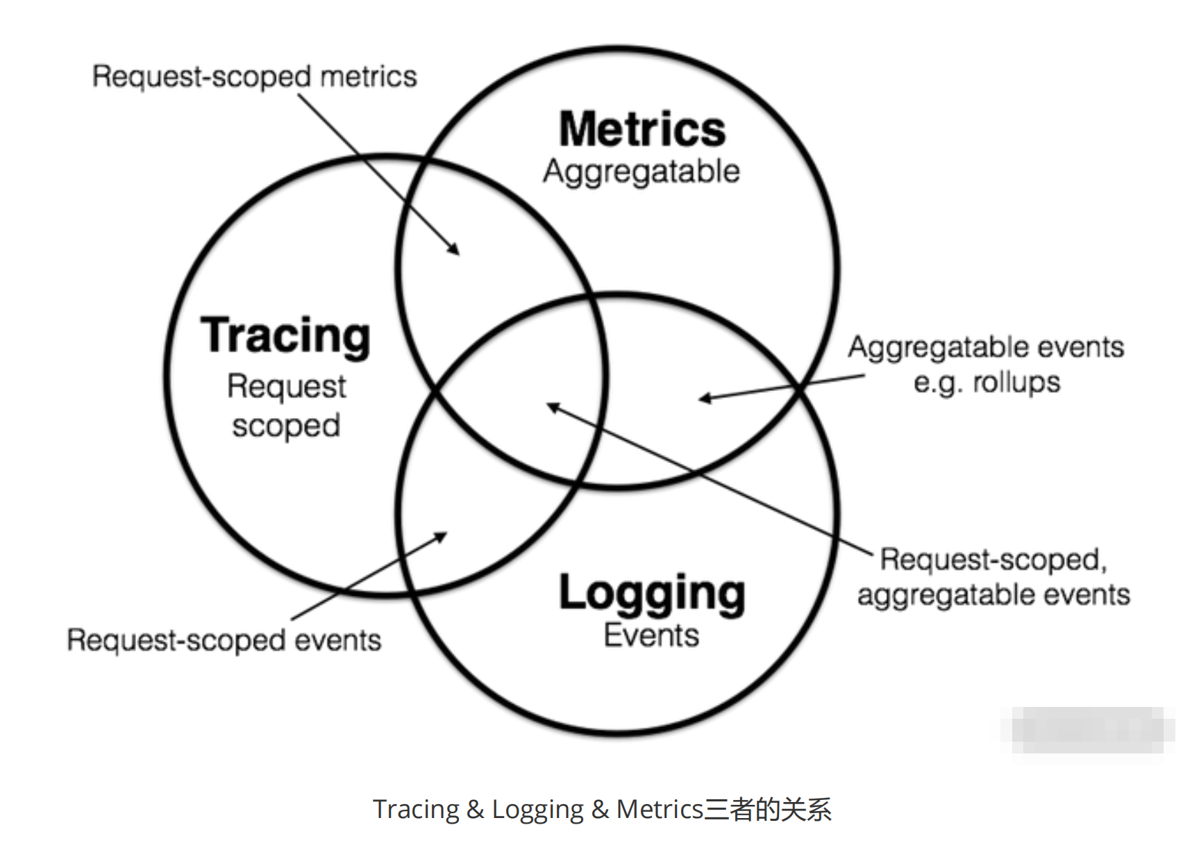 Tracing 表示链路追踪,Logging 和 Metrics 是与之相近的两个概念。这三者的关系如下图所示: