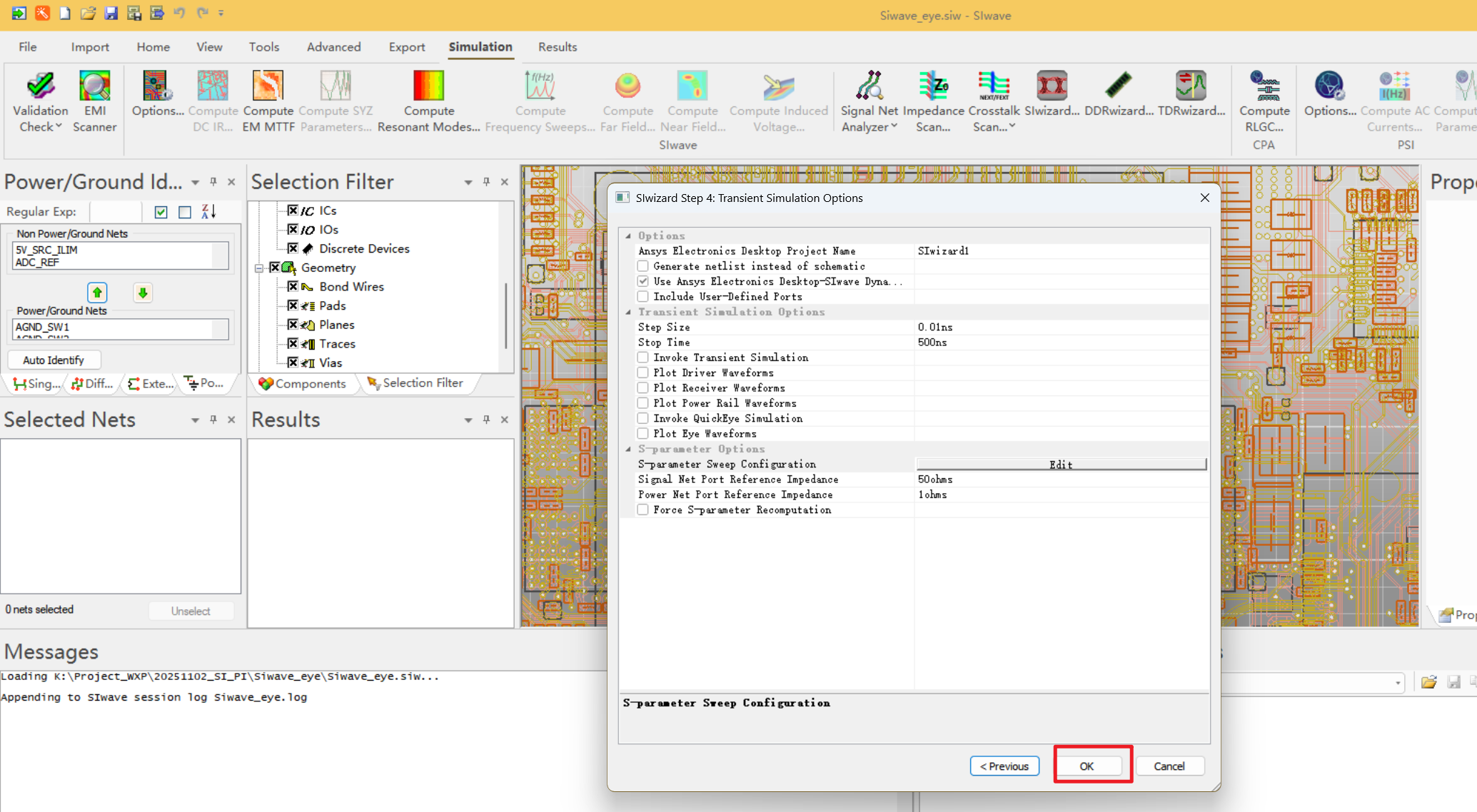 在S参数选项,需要打开查看下,此处仿真信号的速率只有50Mbps,仿真到5GHz是足够的了,此处不进行修改了: