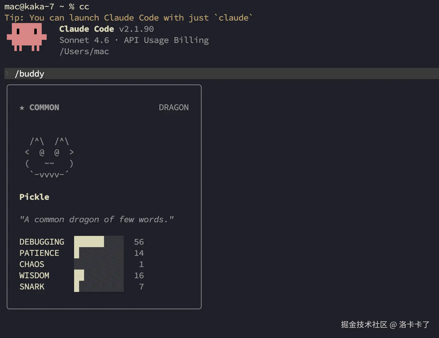 最终把找到的 userID 写进 ~/.claude.json,重启 Claude Code,输入 /buddy。