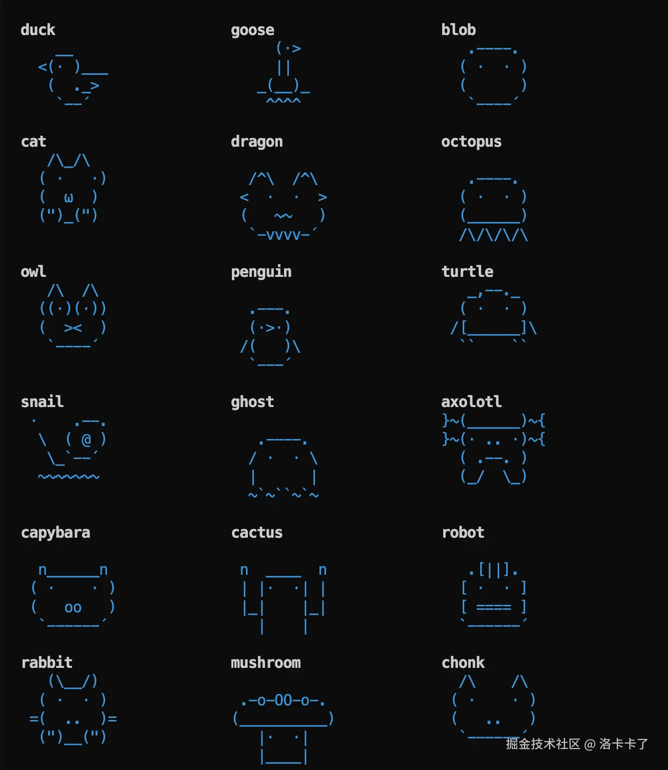 duck 鸭子 · goose 鹅 · cat 猫 · dragon 龙 · octopus 章鱼 · owl 猫头鹰 · penguin 企鹅 · turtle 乌龟 · snail 蜗牛 · ghost 幽灵 · axolotl 蝾螈 · capybara 水豚 · robot 机器人 · rabbit 兔子 · mushroom 蘑菇 · blob 团子 · cactus 仙人掌 · chonk 胖猫