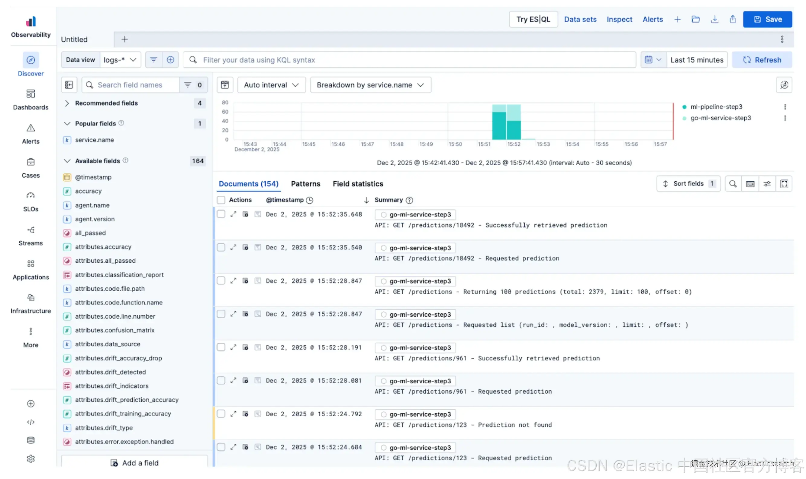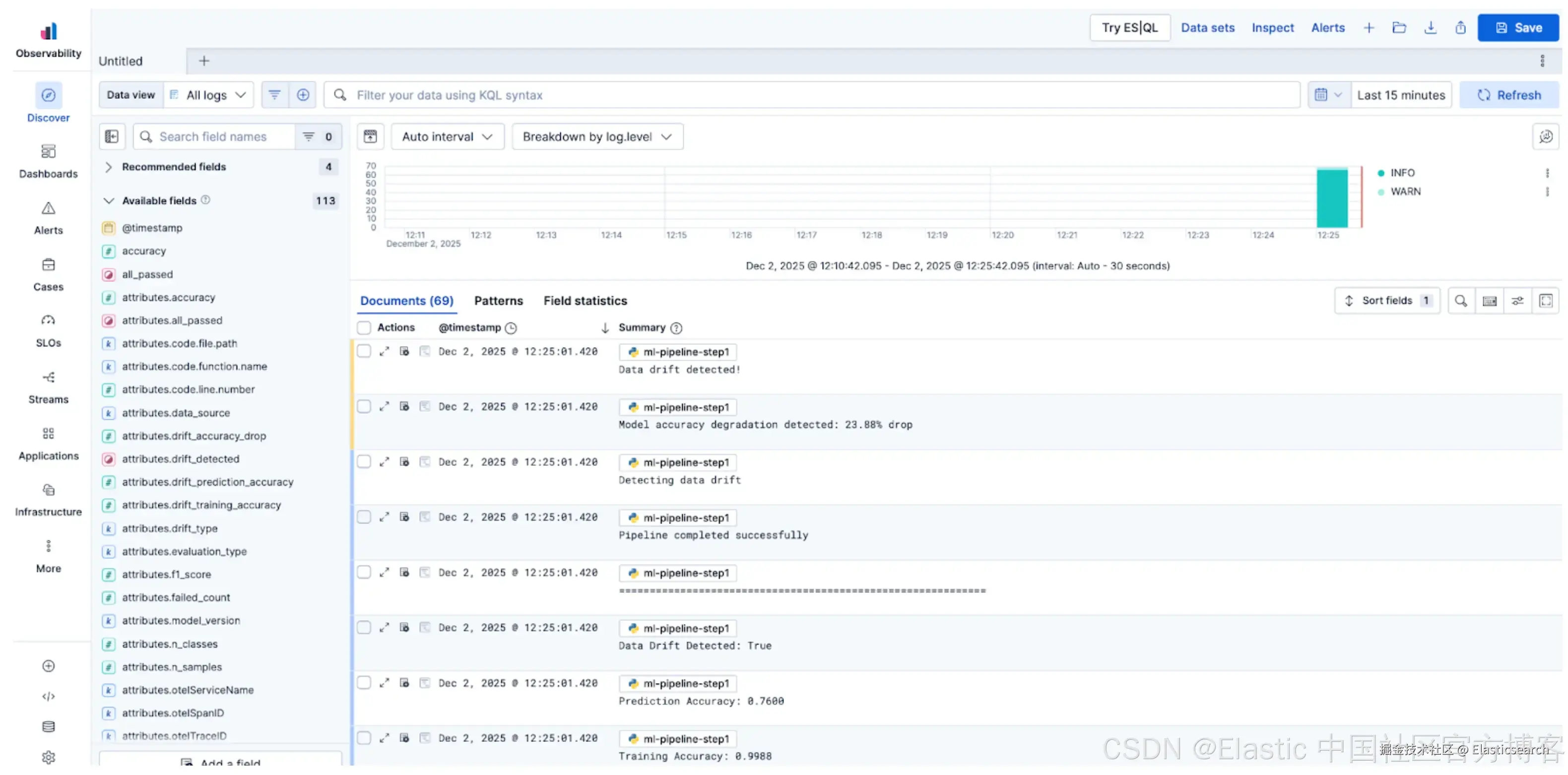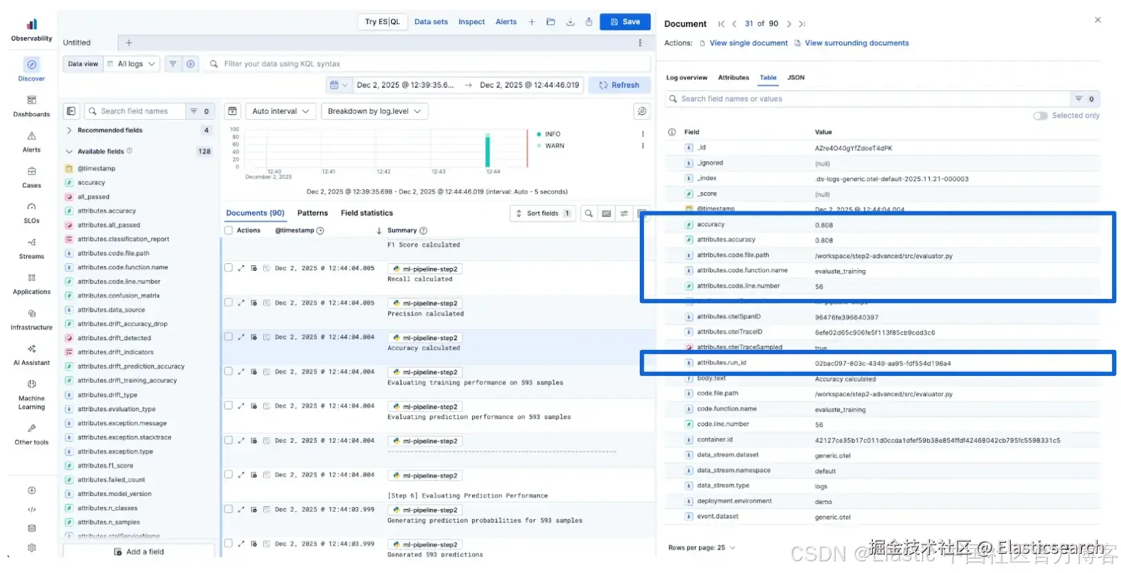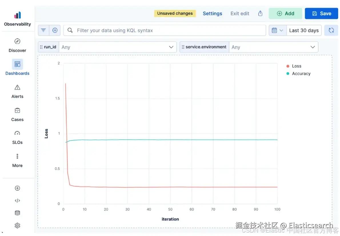 由于 Elastic 处理动态映射,你记录的任何自定义 metrics 或属性,例如模型 ids、训练准确率或漂移检测,都会被即时索引,并可在 Discover 中搜索或通过 Dashboards 进行可视化。