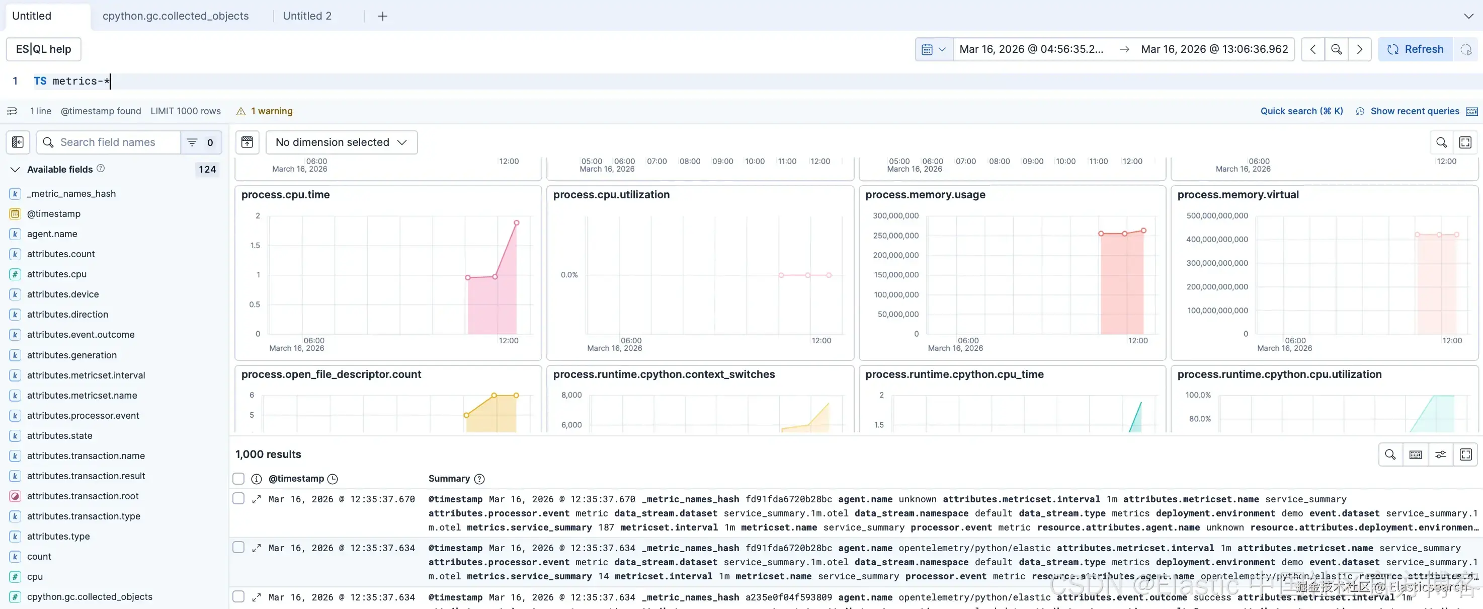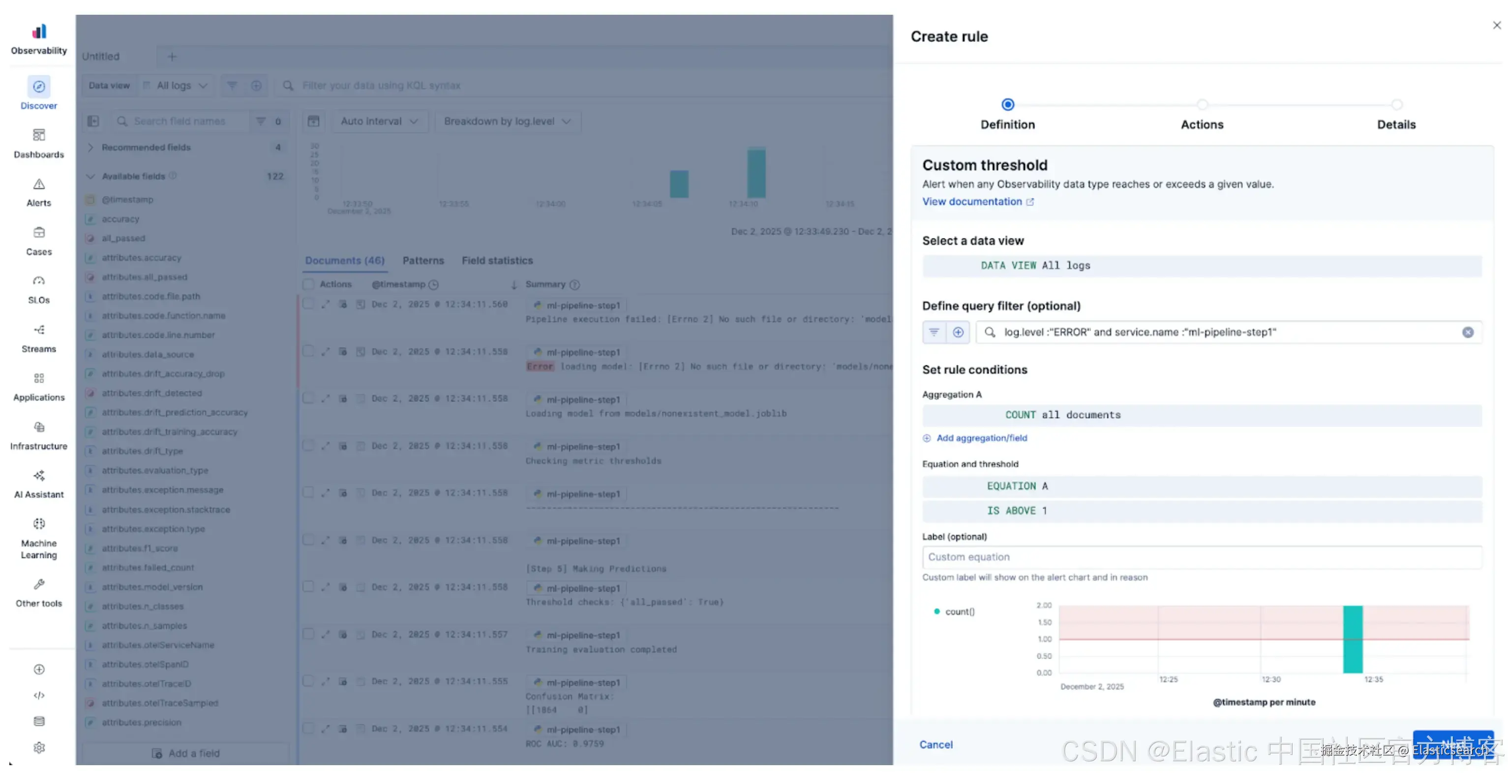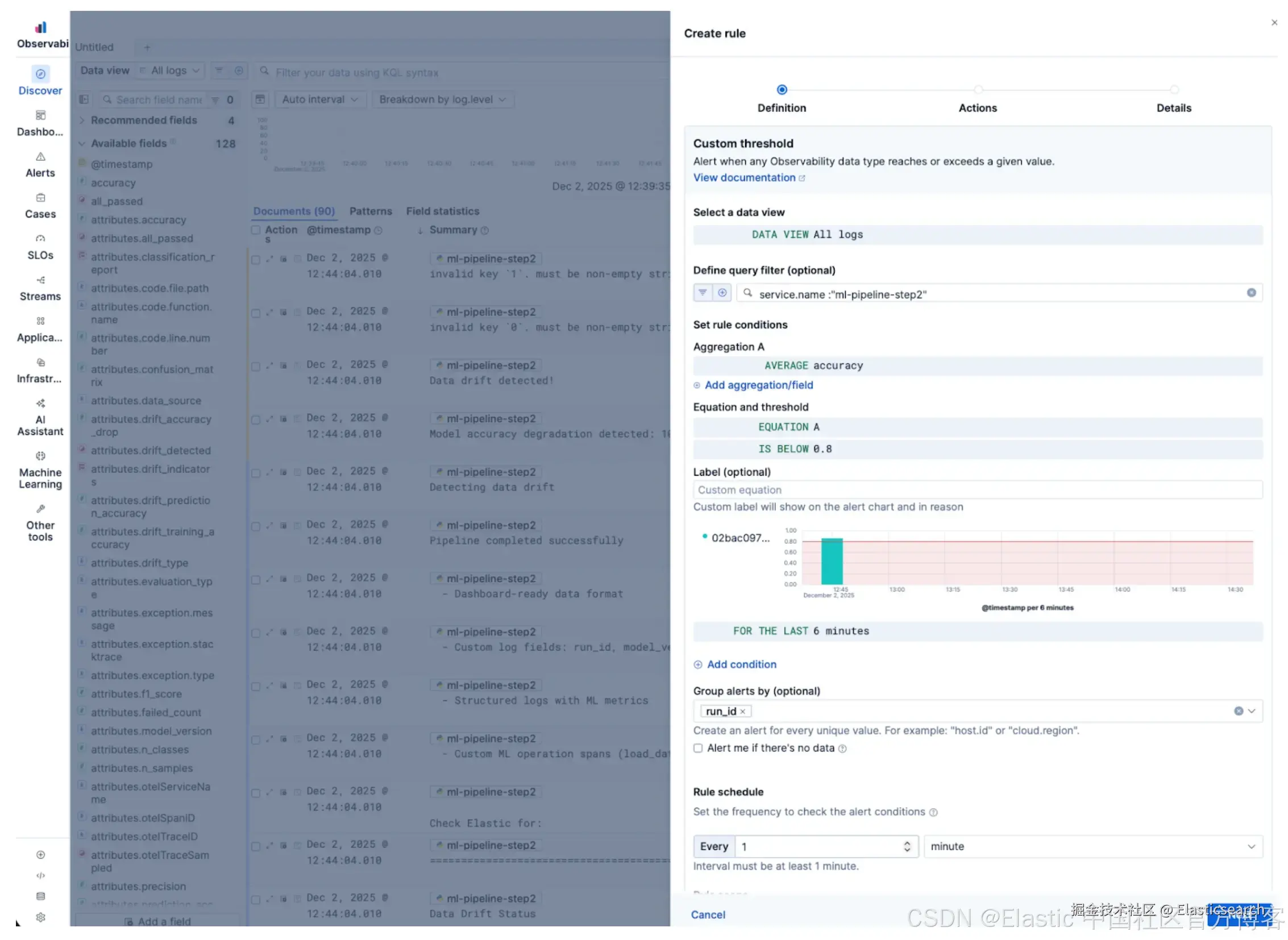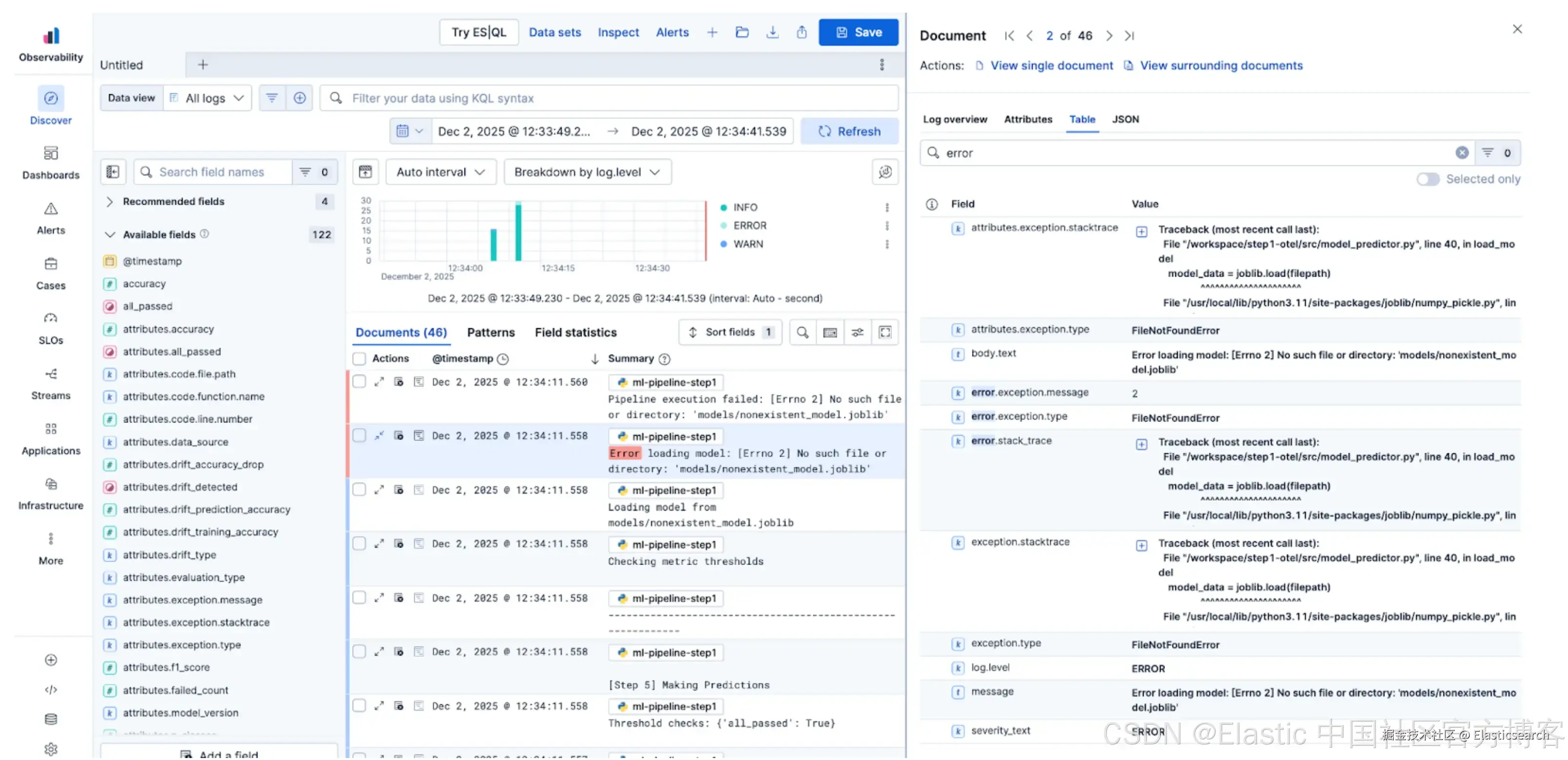 由于 Elastic 处理动态映射,你记录的任何自定义 metrics 或属性,例如模型 ids、训练准确率或漂移检测,都会被即时索引,并可在 Discover 中搜索或通过 Dashboards 进行可视化。