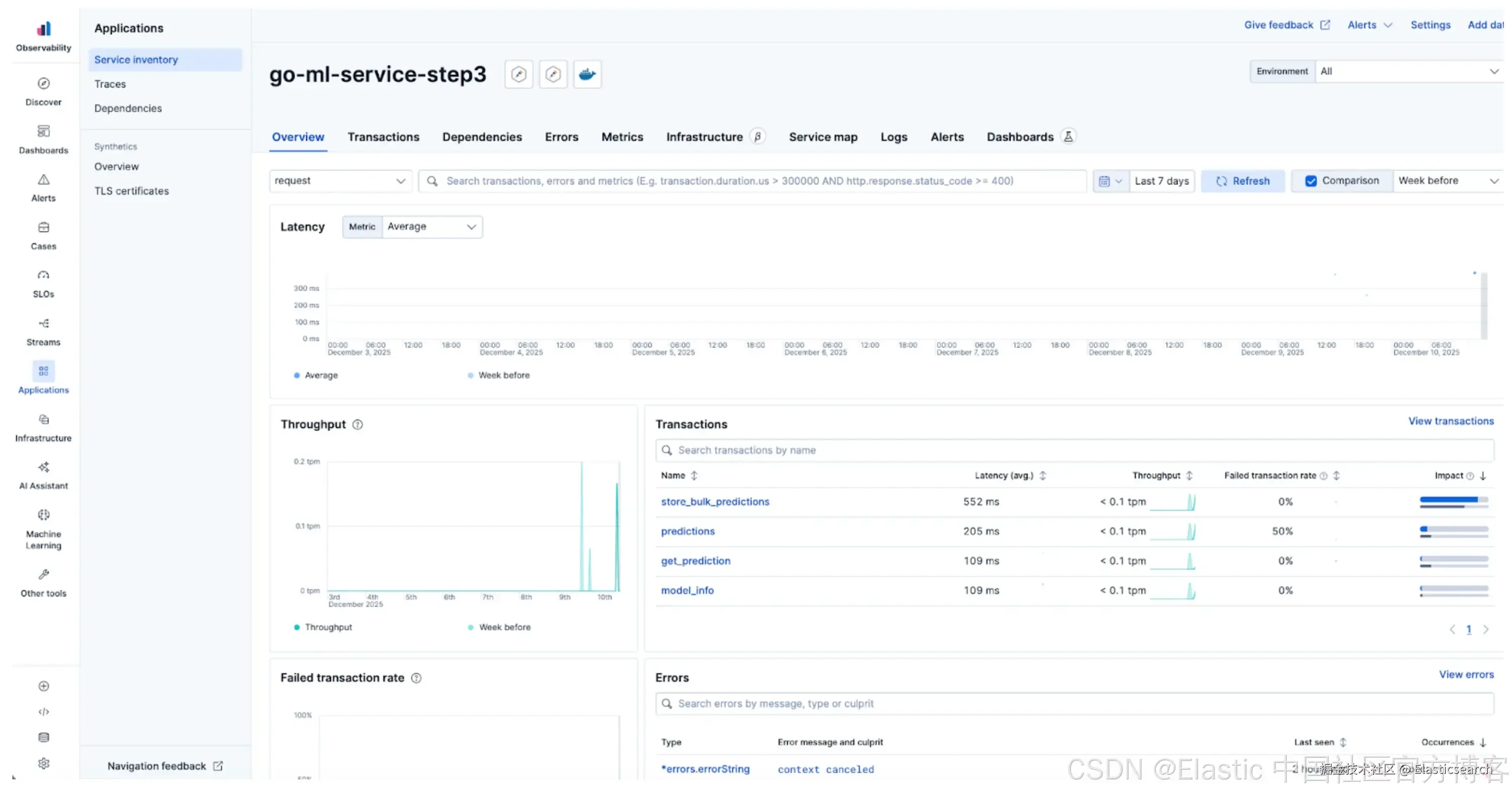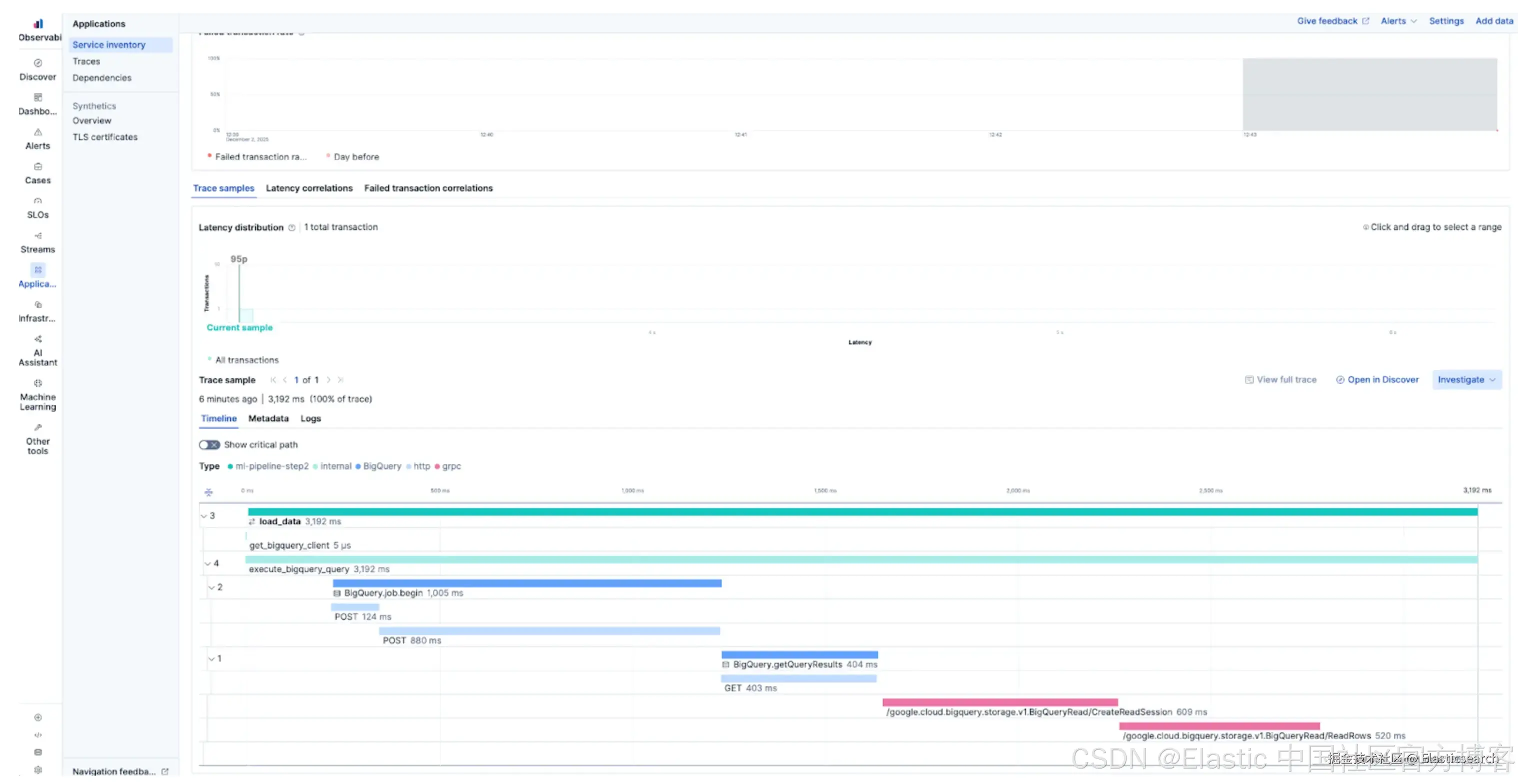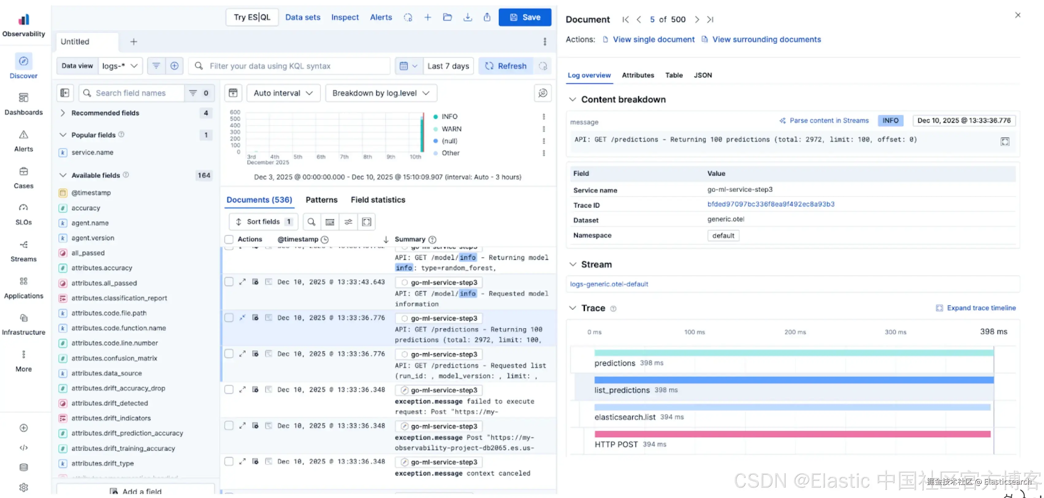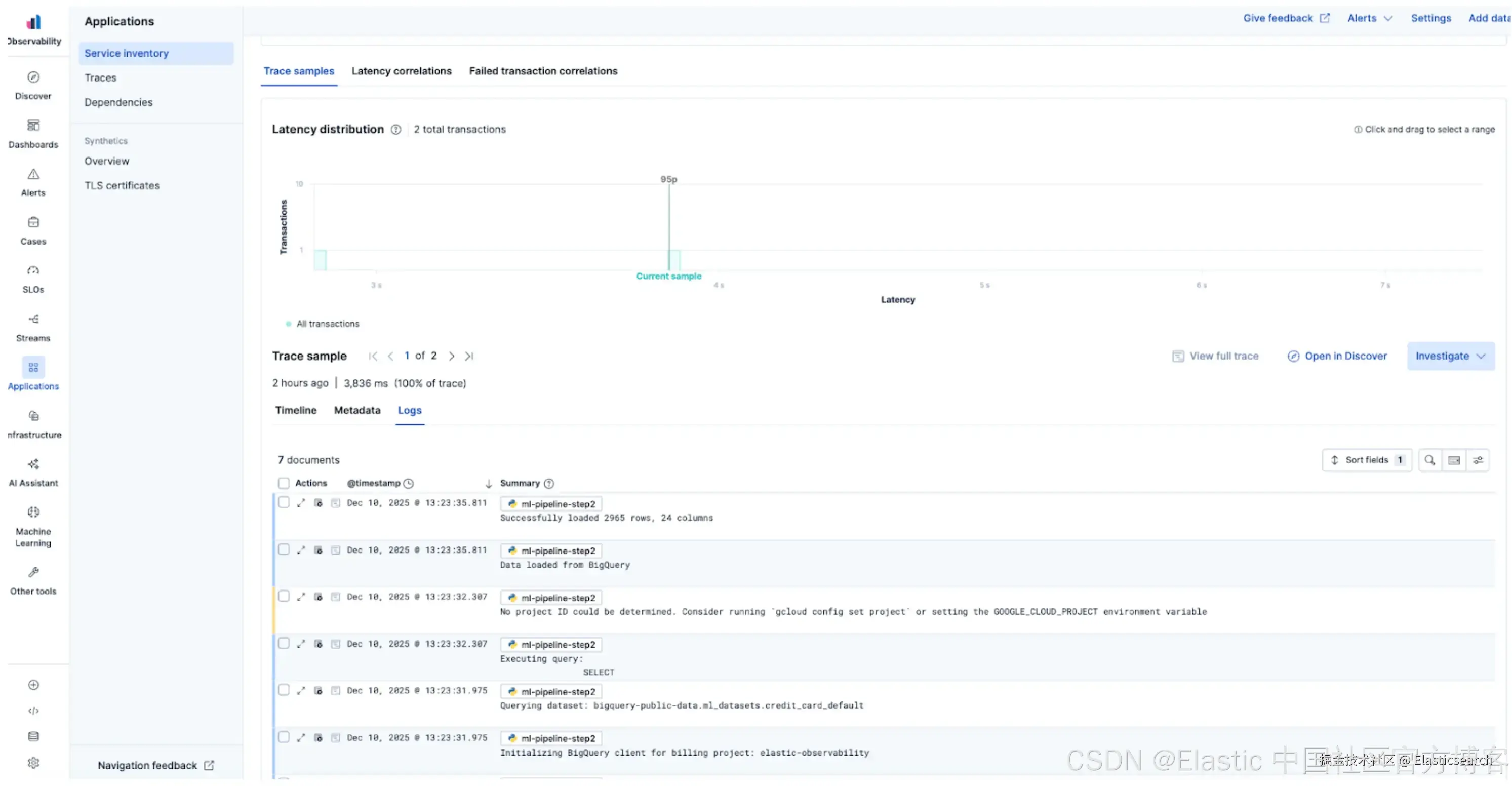 在 Elastic 中生成的分布式 trace 将整个过程拼接在一起。你可以看到 Go API 与 Python 模型所花时间的精确分解,并在单一统一视图中关联两个服务的日志。