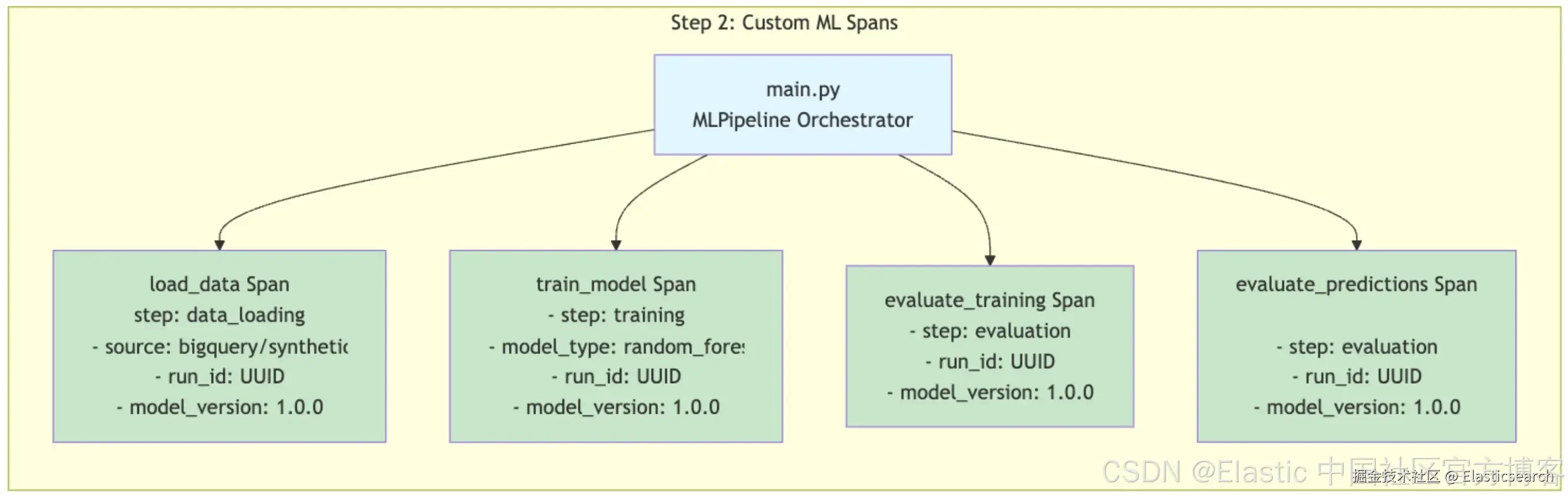 自动 instrumentation 只是起点。对于 ML 和 AI Ops,需要在业务阶段周围添加显式 spans,并附加运行元数据。Elastic 的 schema 灵活性和动态映射使其非常适合用于仅属于你的管道或特定实验的自定义属性或 metrics。你无需在写入数据之前就知道数据的结构。你可以动态创建新参数,Elastic 会自动映射,并且你可以立即对其进行跟踪。