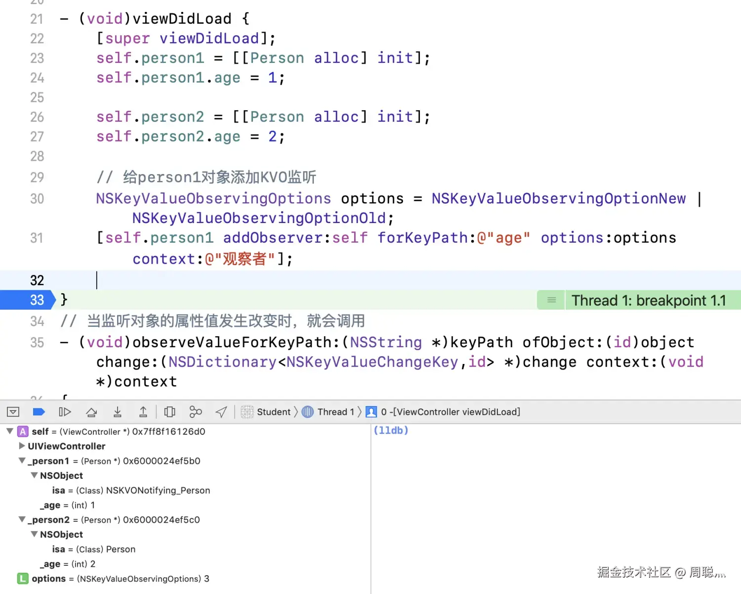 给新建的Person类创建对象person1与person2,并对person1的age属性添加observer(键值观察)。