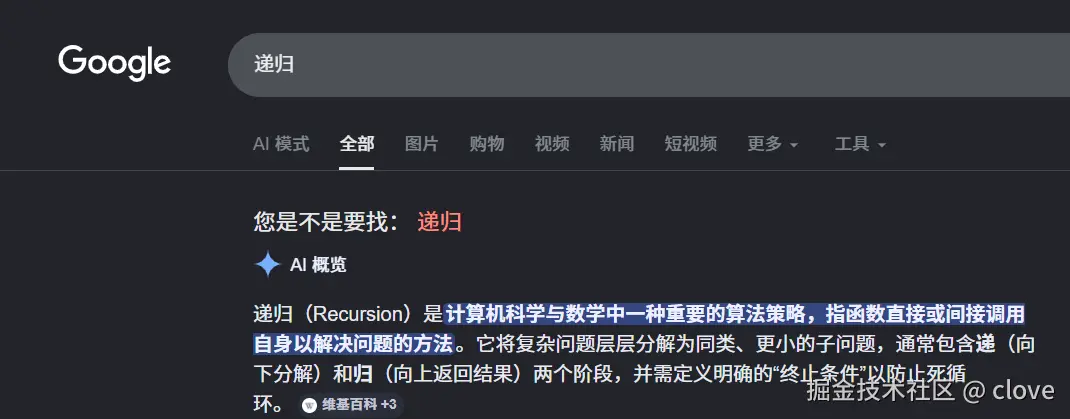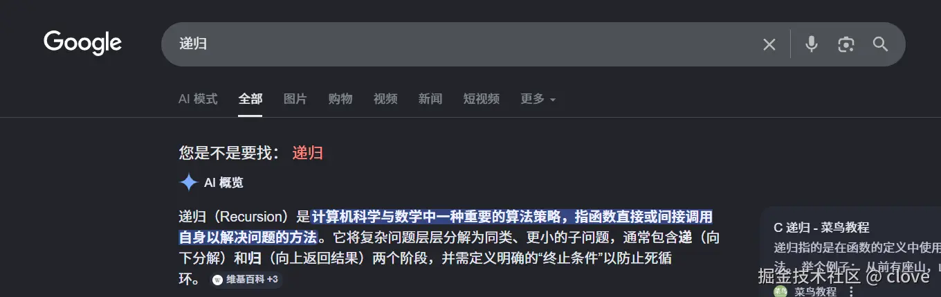 又例如 你浏览器搜索 "递归" 结果页面上又有一行字问你,您是不是要找'递归'