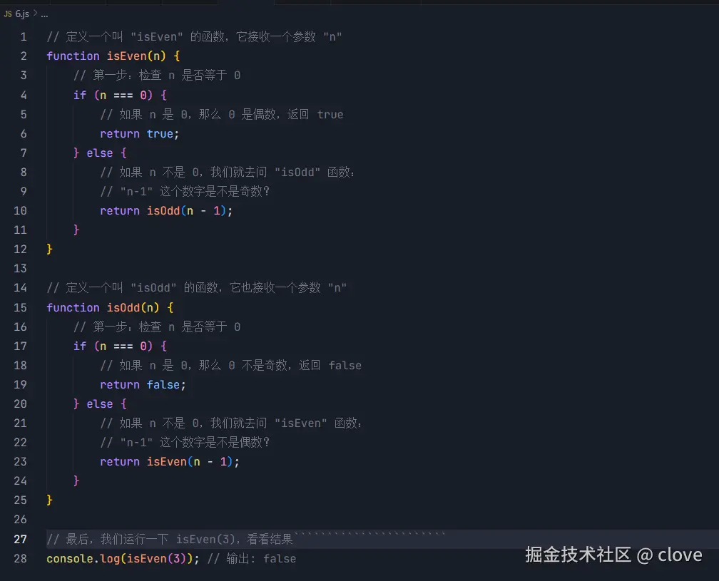 13 return isEven(n - 1); // 调用 isEven