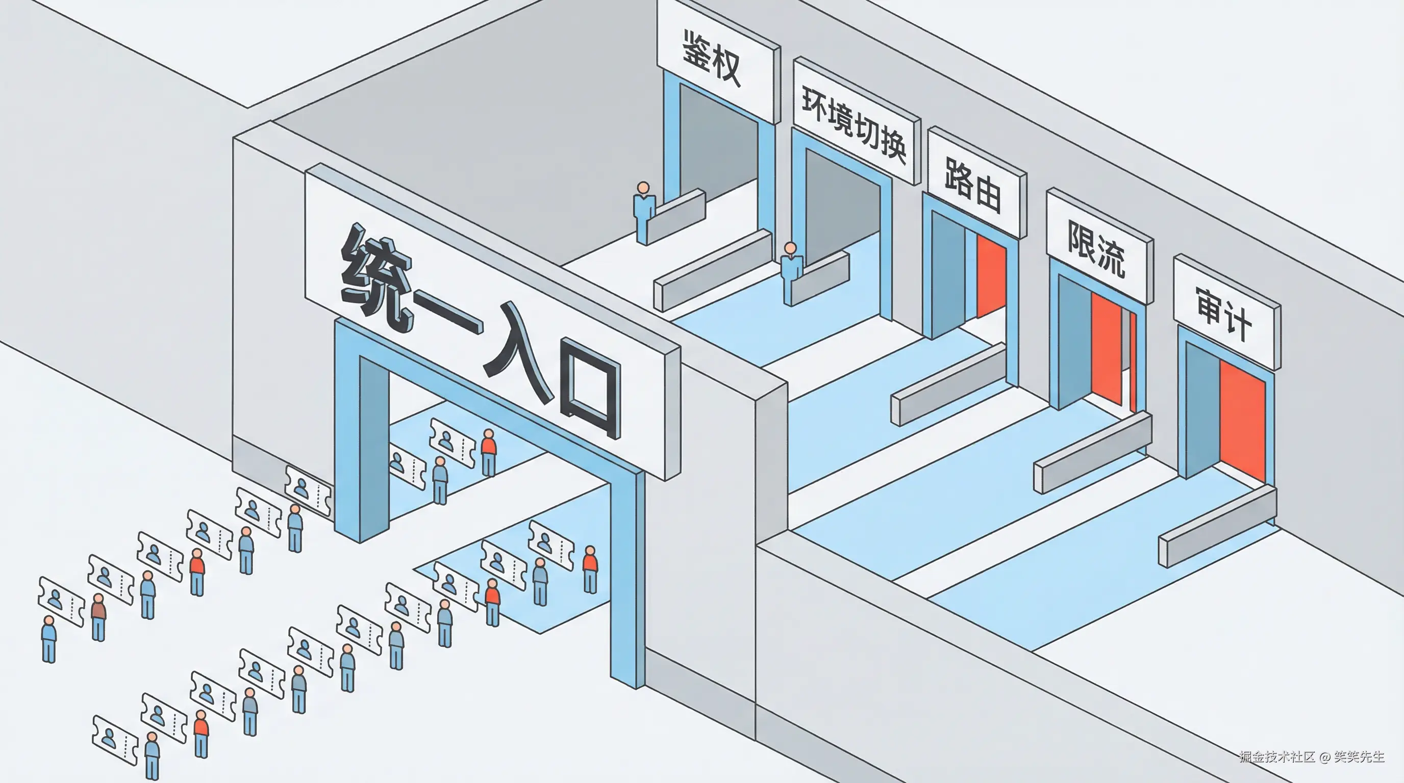 图注:所有前端请求在这里统一安检、分流,走向正确的后端服务。