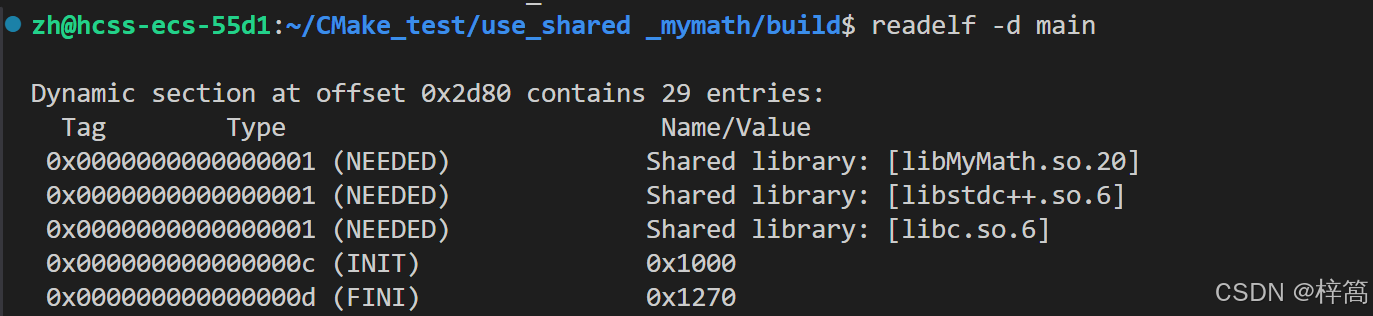 以上,我们观察到 main的 DT_RUNPATH 中记录了 /usr/local/lib,这正是 动态库libMyMath.so.20 的路径, 所以main在运行时是能找到 自己依赖的动态库的!