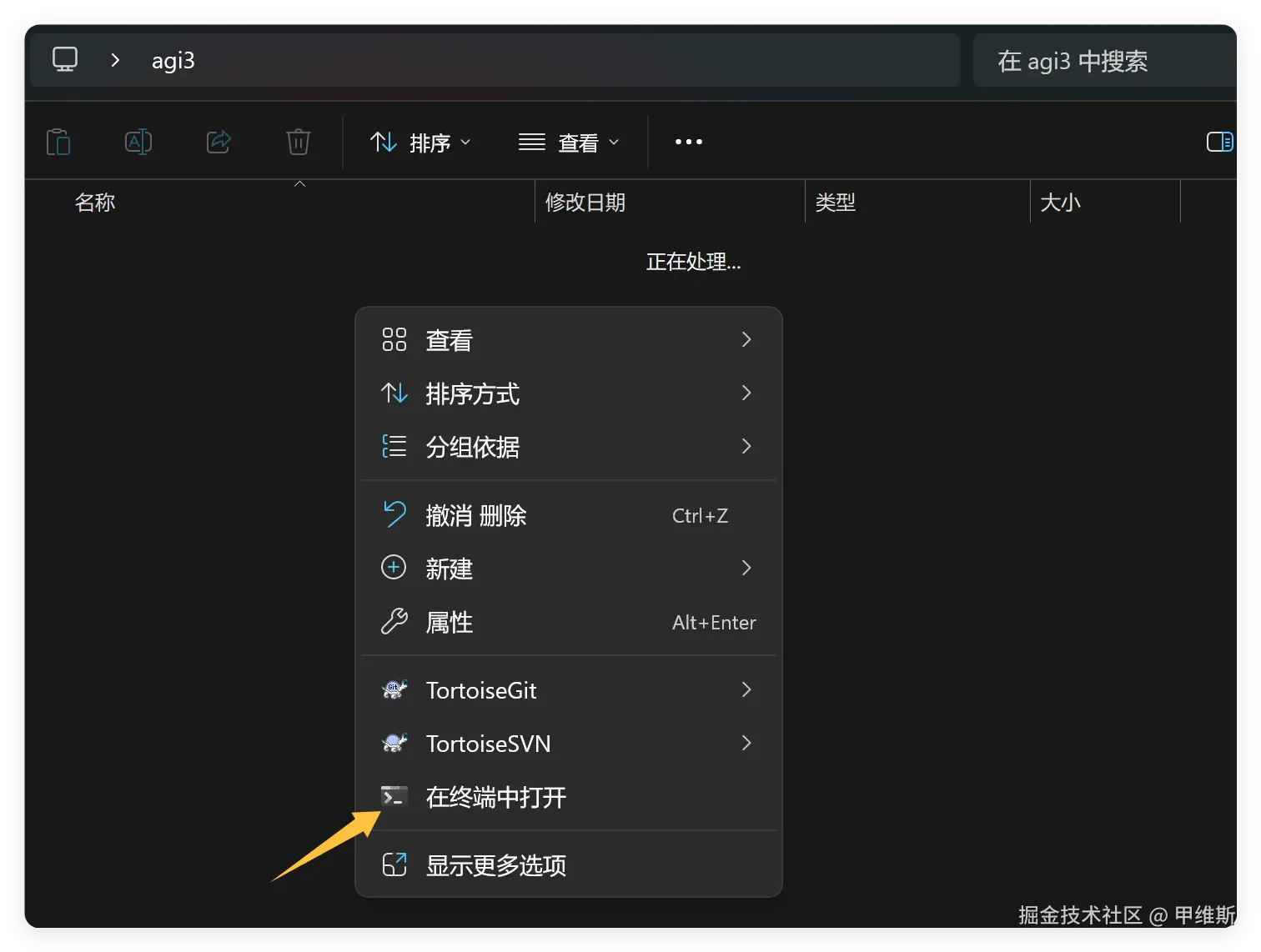 打开 agi3 这个文件夹,然后右键,在终端中打开。