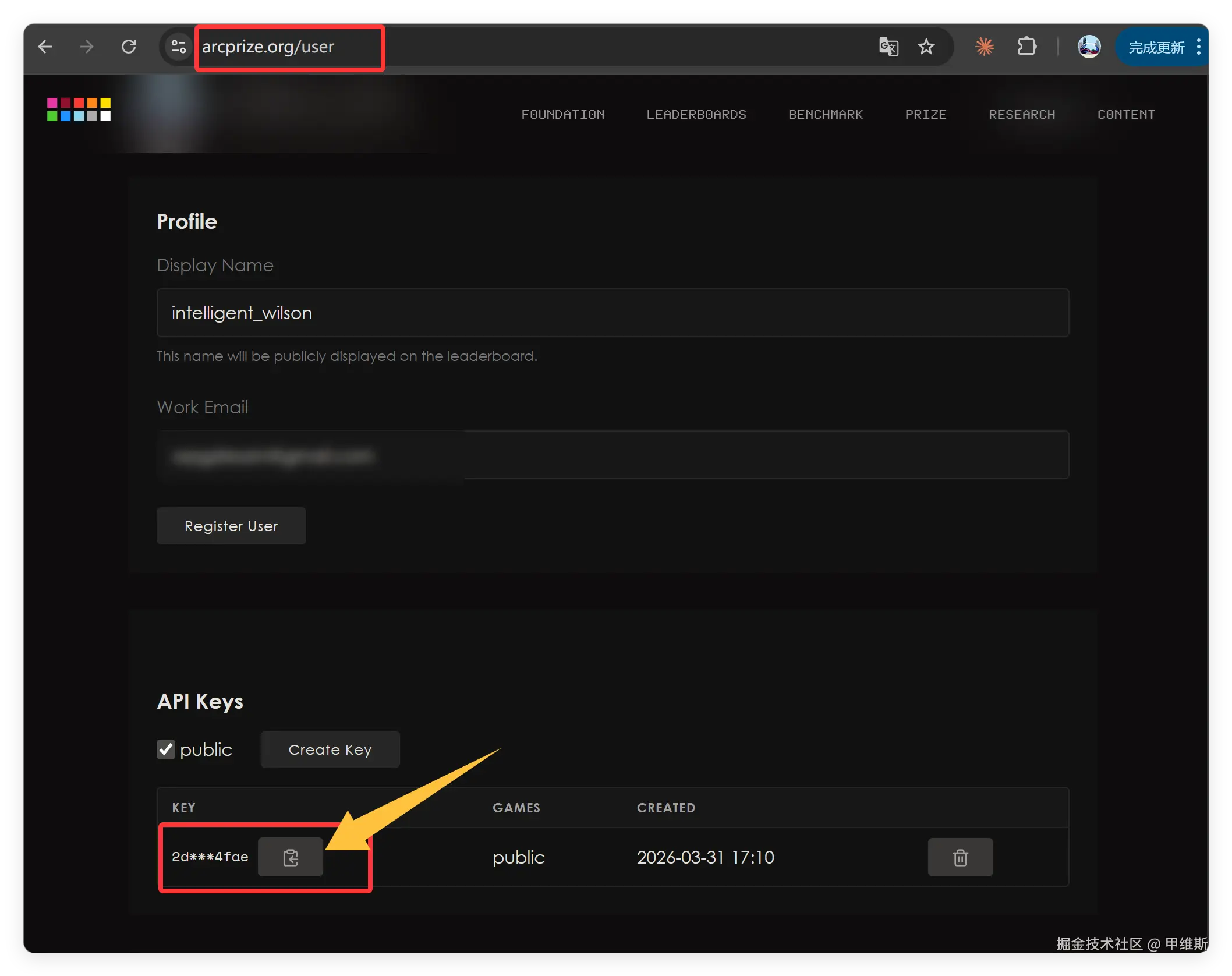 可选择设置您的 ARC_API_KEY。如果未提供密钥,将使用匿名密钥。不过,注册 API 密钥将使您在发布时能够访问公共游戏。获取 ARC_API_KEY