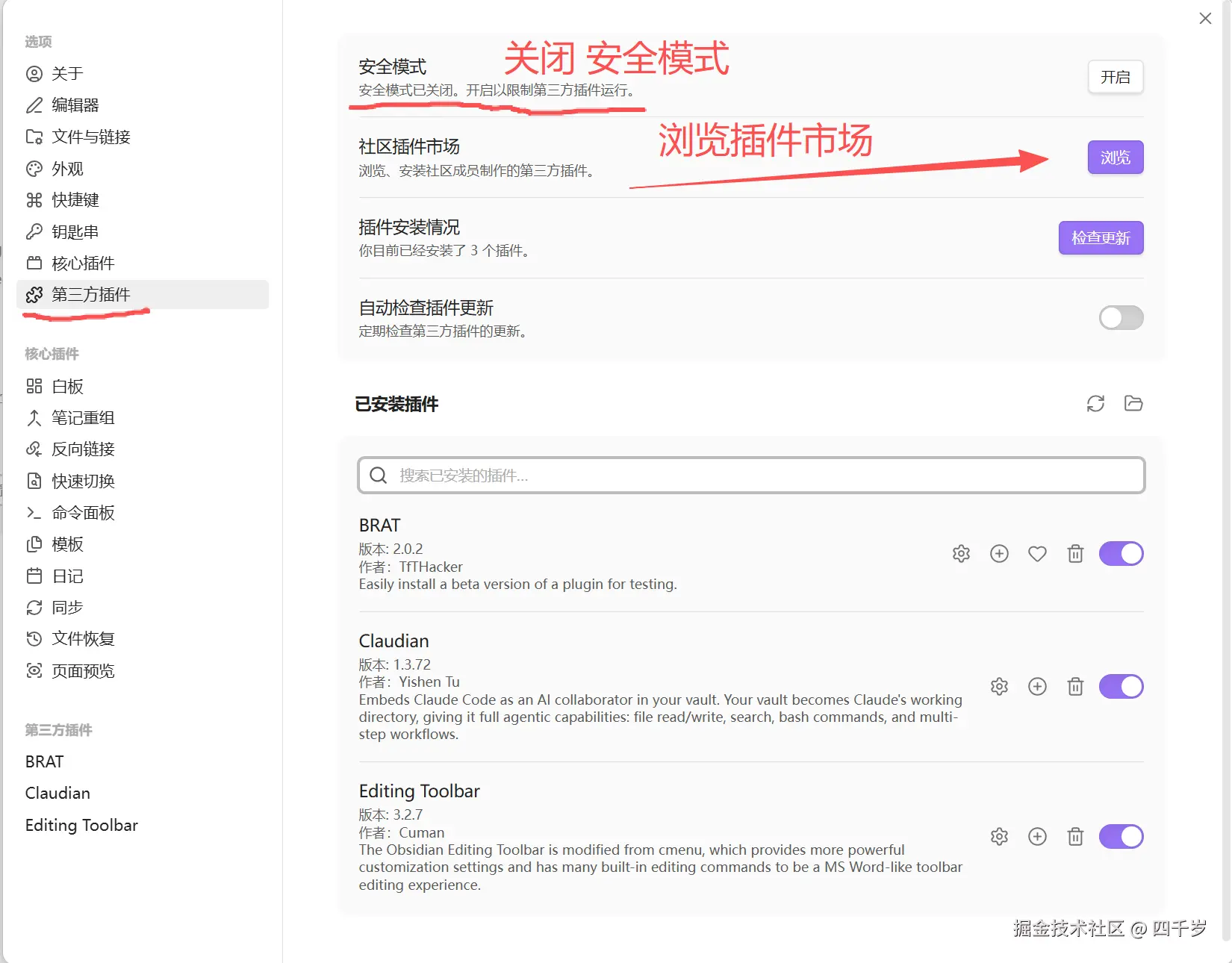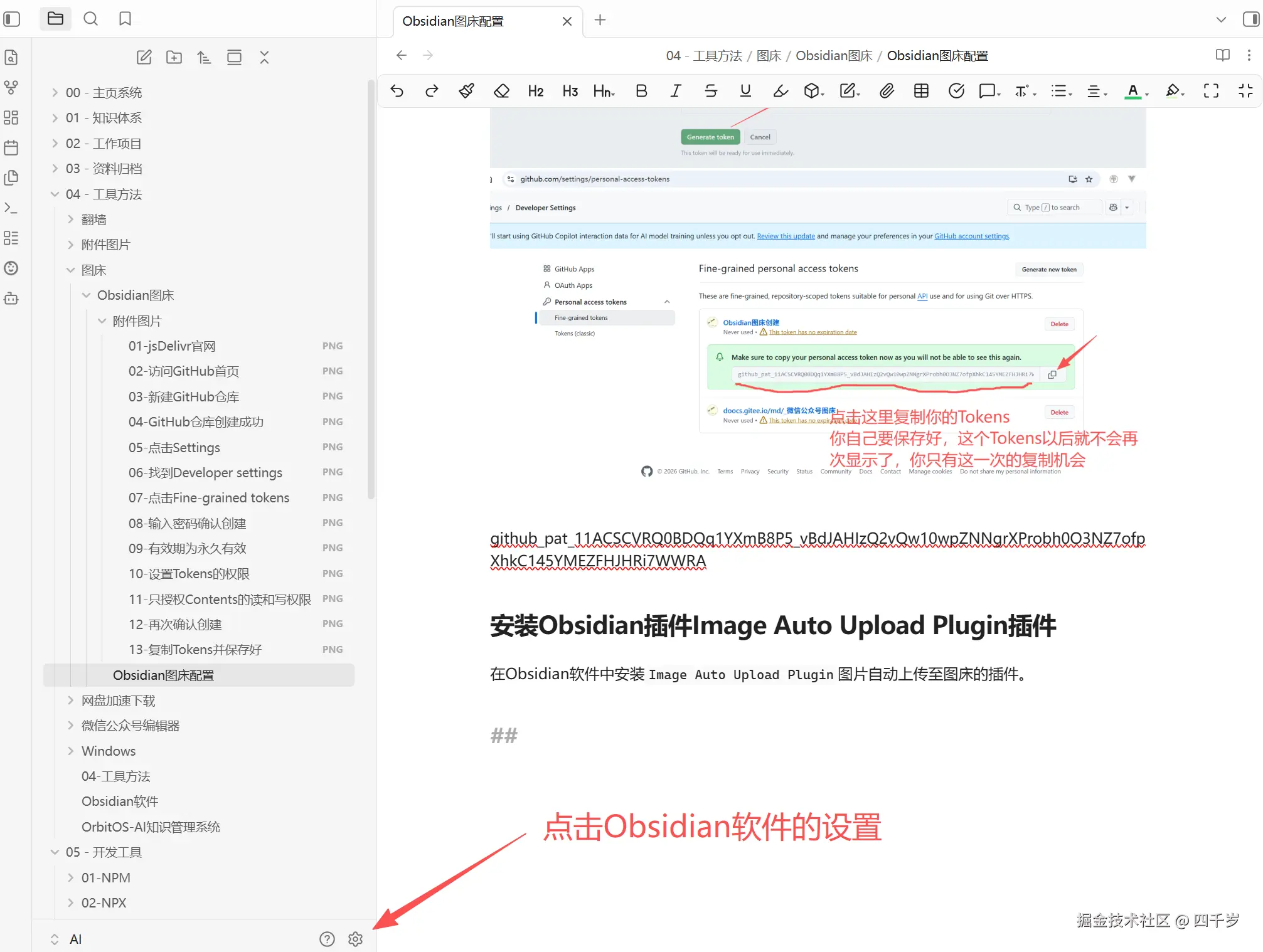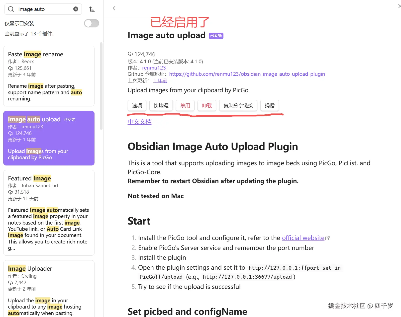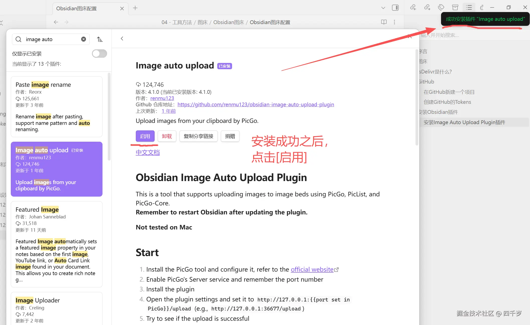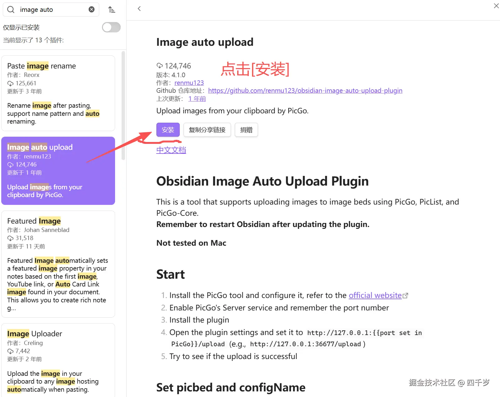 在 Obsidian 软件中安装Image auto upload(图片自动上传至图床)的插件。