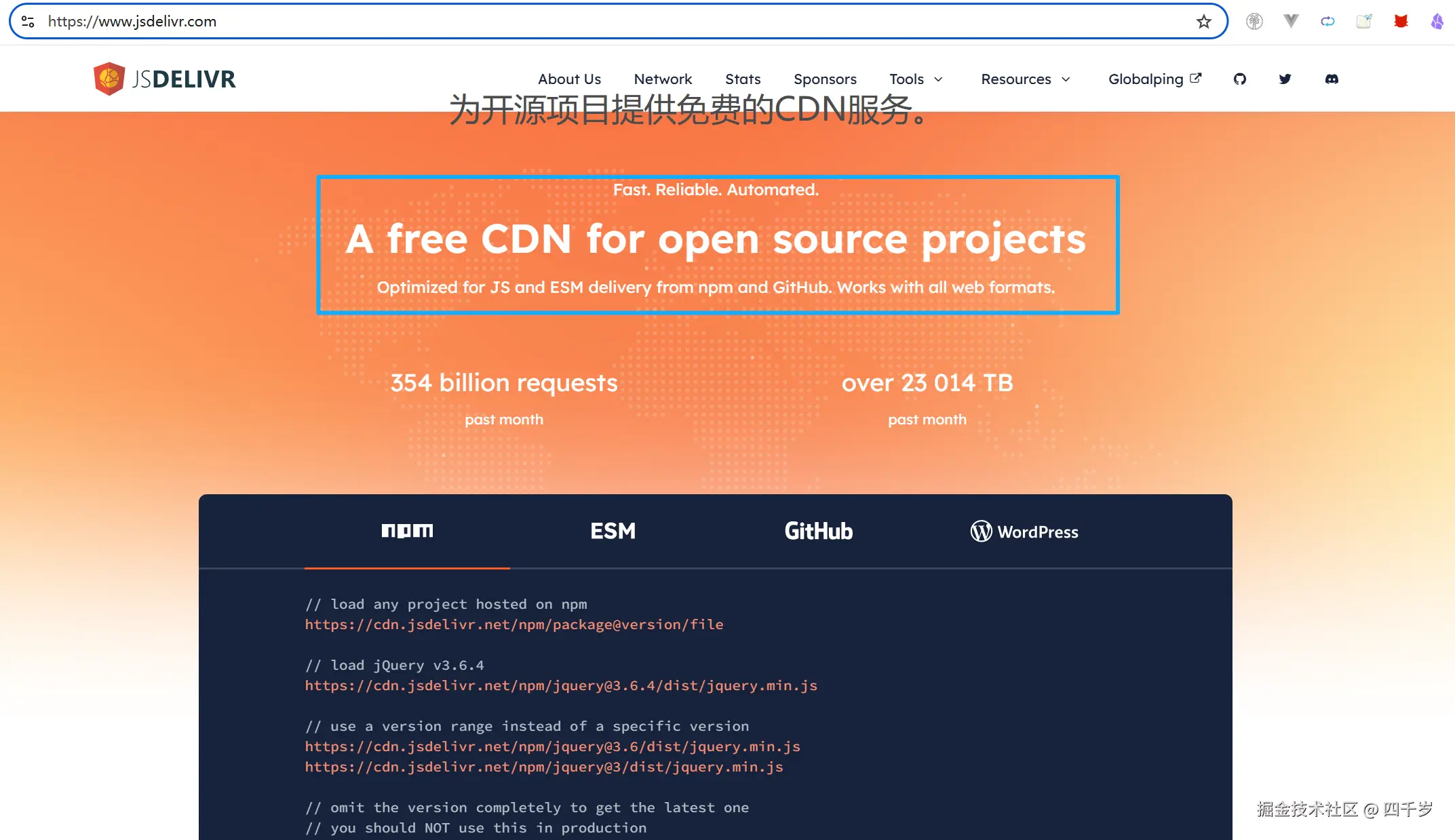 jsDelivr是一个免费、开源的CDN。CDN的全称是 Content Delivery Network(内容分发网络)。 jsDelivr 官网: