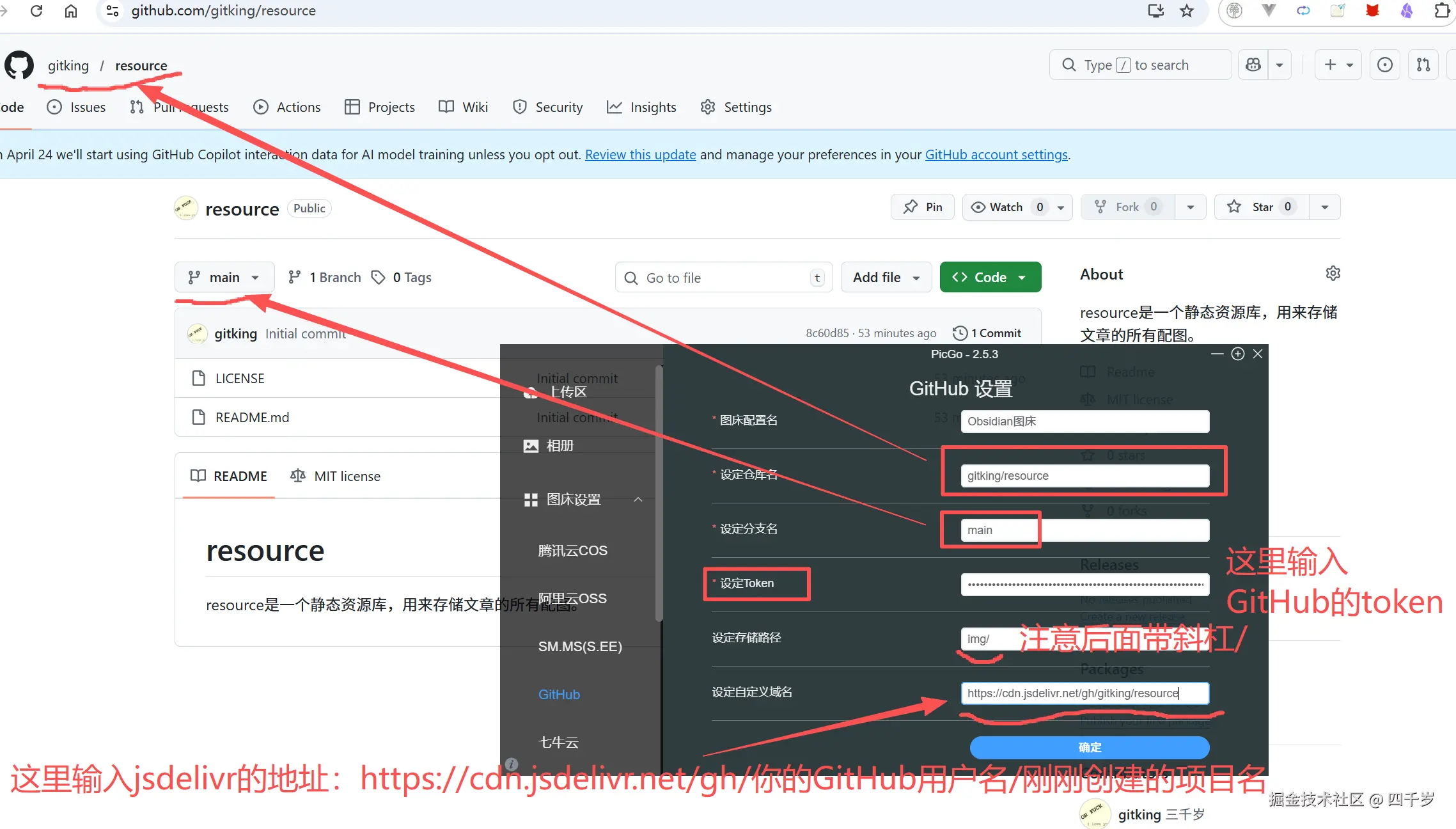 - 设定仓库名:格式为「GitHub 用户名 / 仓库名」(需包含斜杠 "/");
