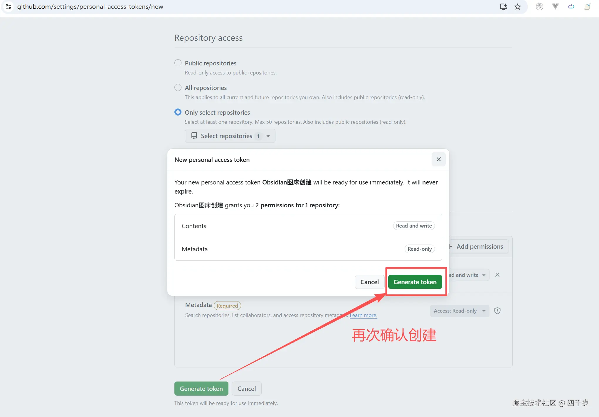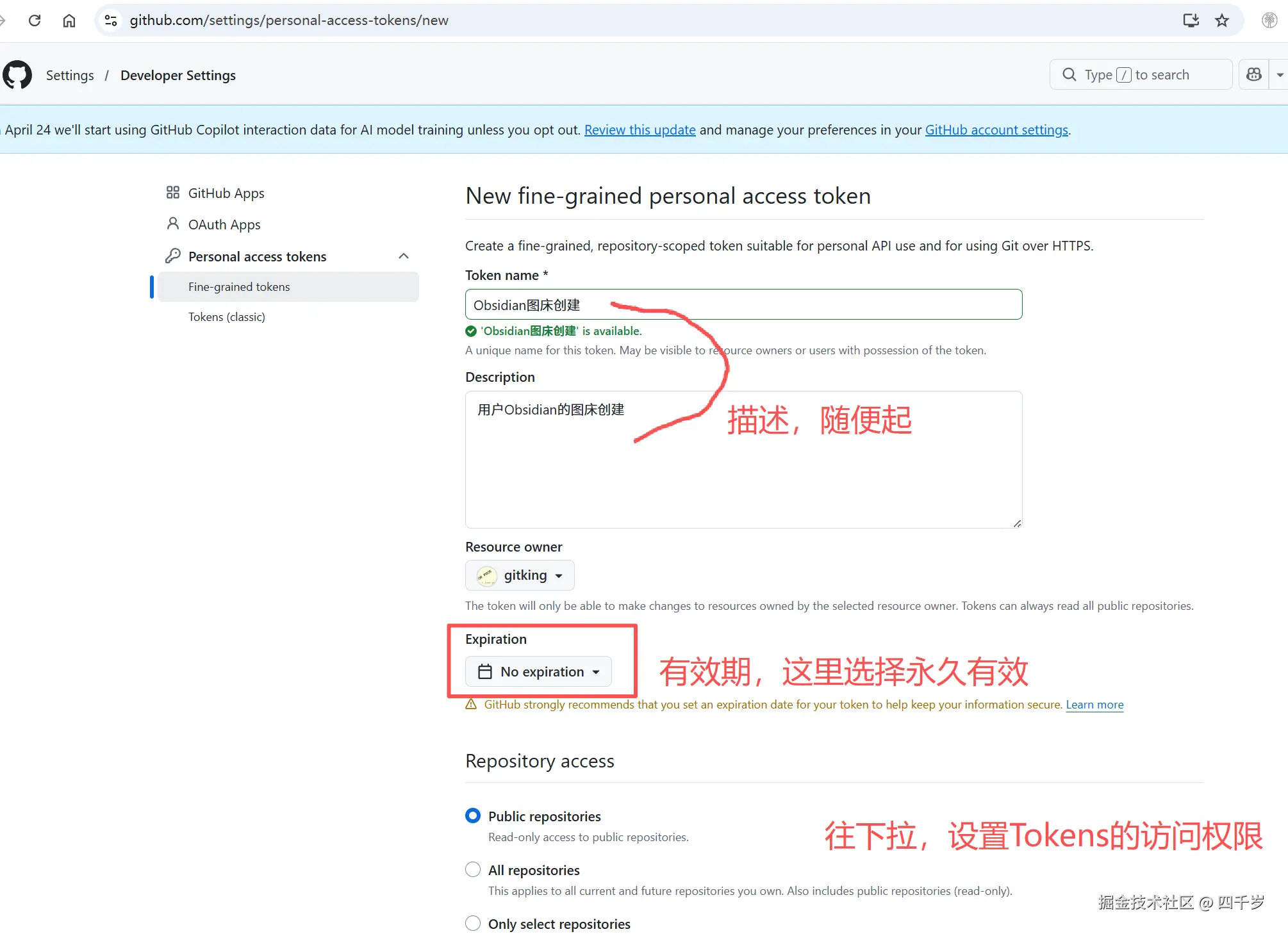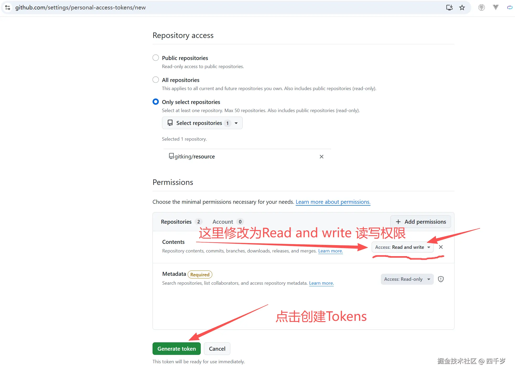 不过不用担心,可以限制这个 Token 的访问权限,仅授权该 Token 访问并编辑我们刚创建的resource仓库。创建 Tokens 流程如下: