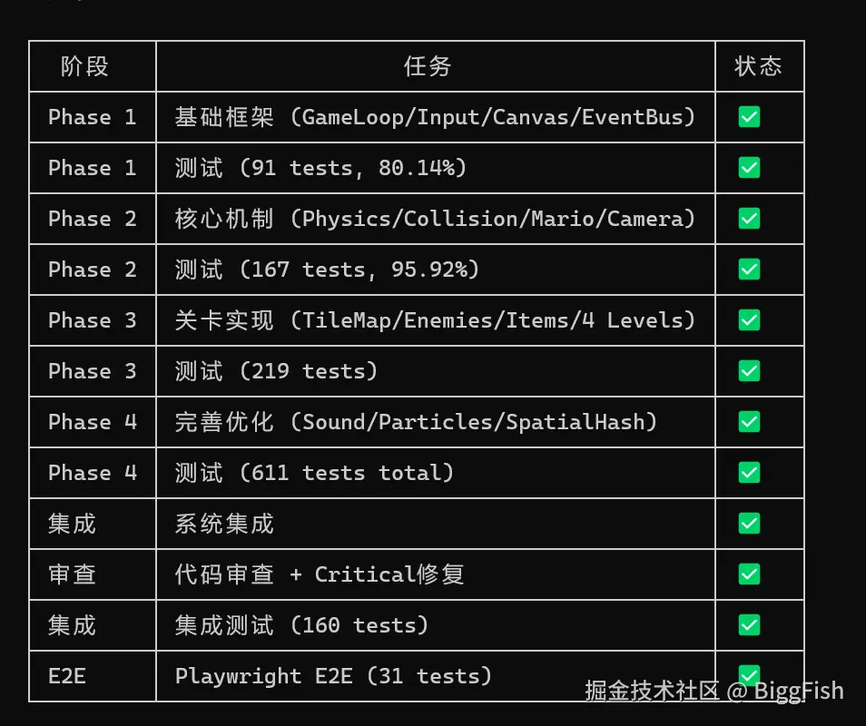 这意味着 Phase 3 开始写关卡的时候,Phase 1 的 91 个测试已经在守着基础框架了。如果 Phase 3 的代码破坏了 GameLoop 或 EventBus,那 91 个测试会立刻拦住。