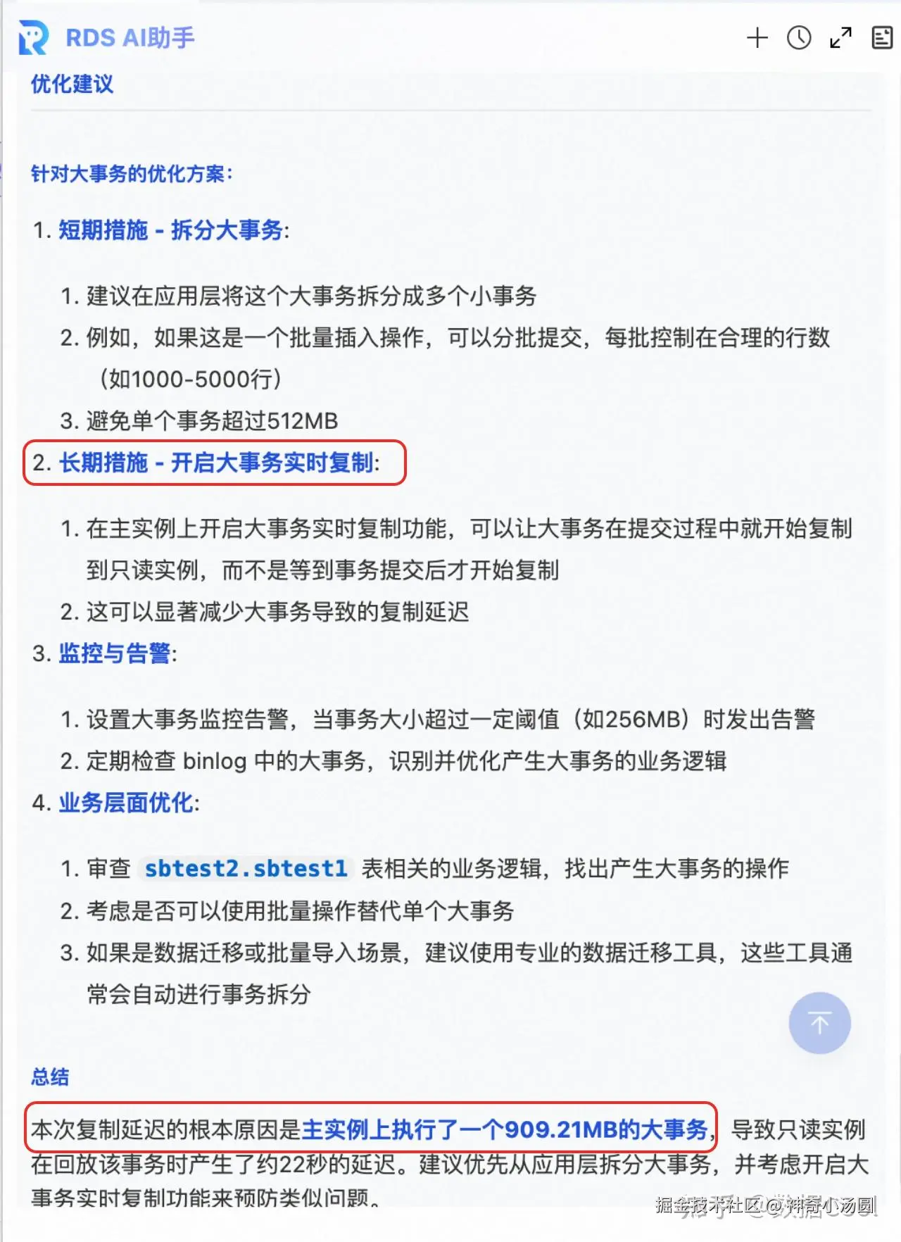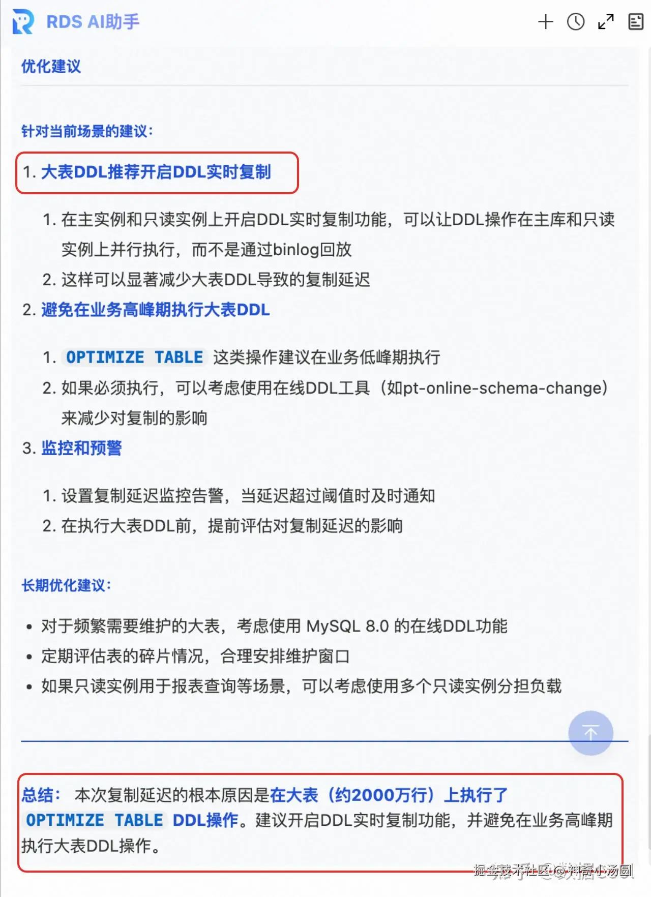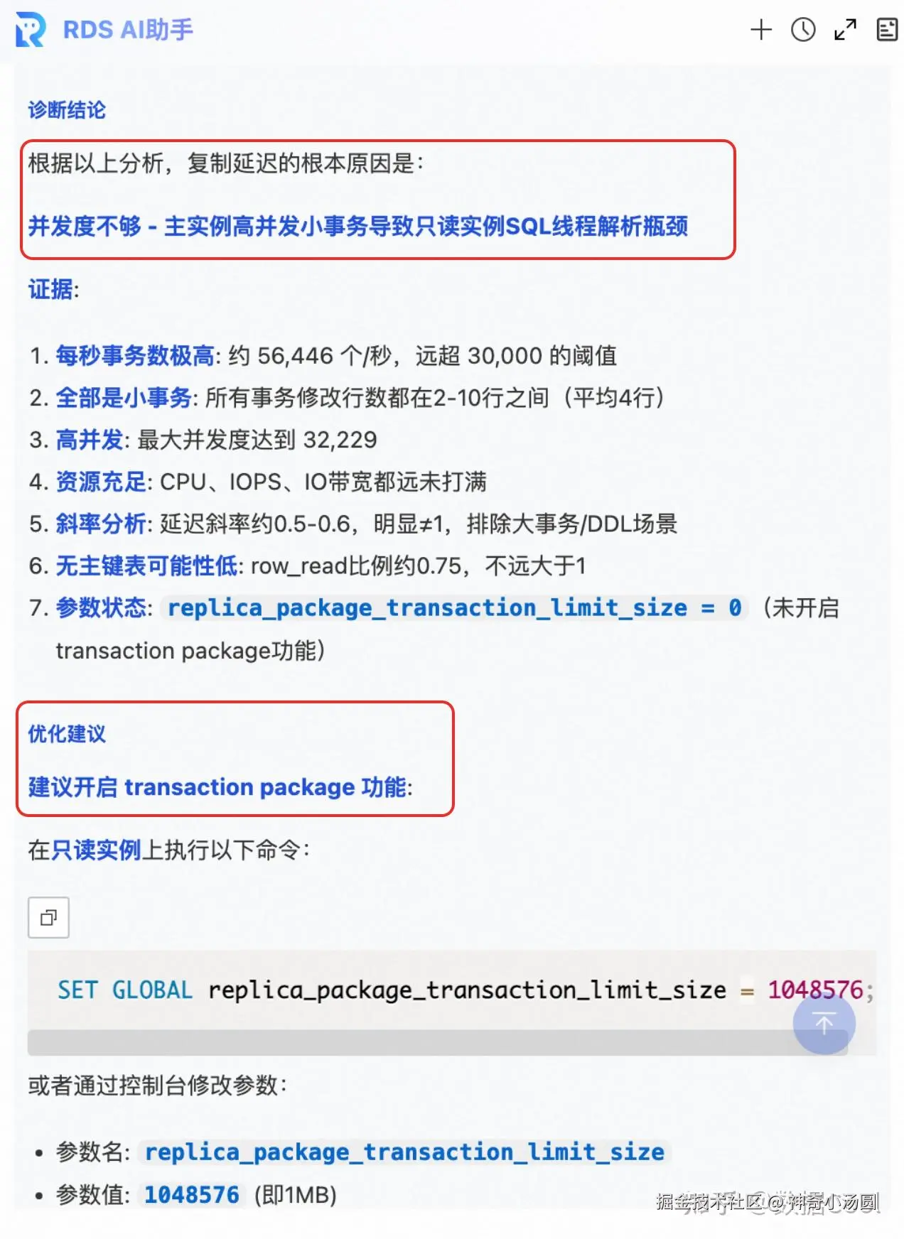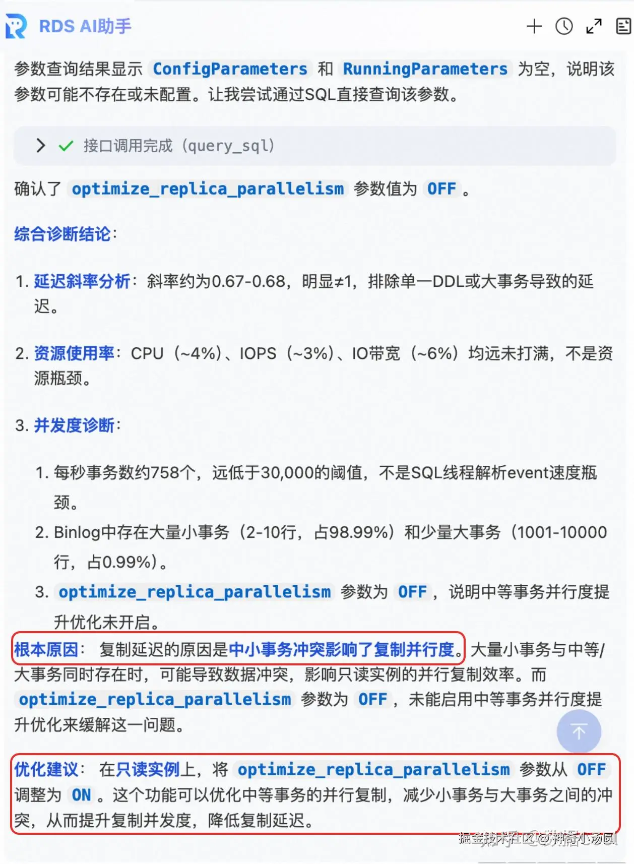 AI 助手查看监控了,解析binlog并结合实例进行分析,最终诊断出了四段延迟的根本原因,并给出了解决延迟问题的优化建议。
