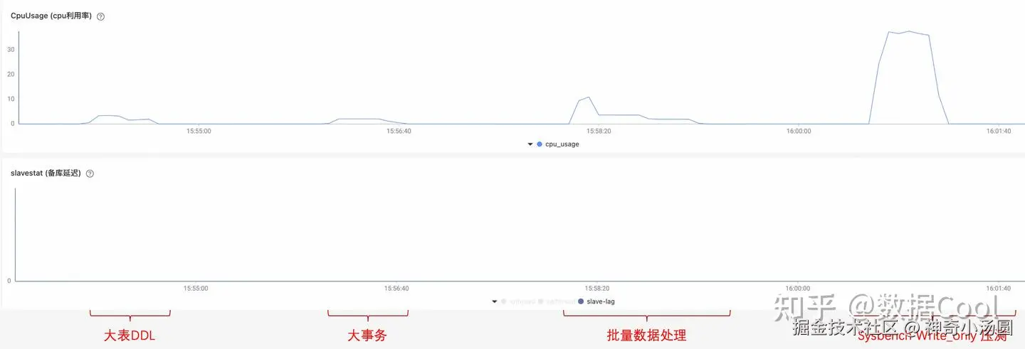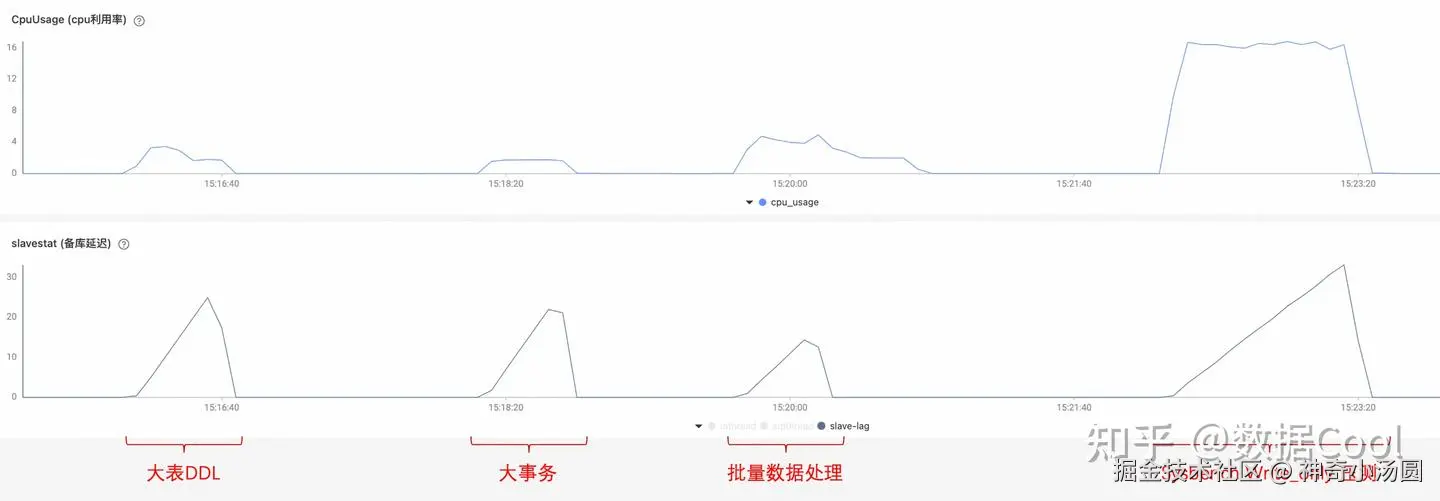 大事务和DDL在从库执行期间,从库的复制延迟计算方法为now - 主库提交时间。大事务和DDL在主库提交时间是固定的,因此其复制延迟每秒一定增加1,复制延迟曲线一定是一条斜率为1的直线。