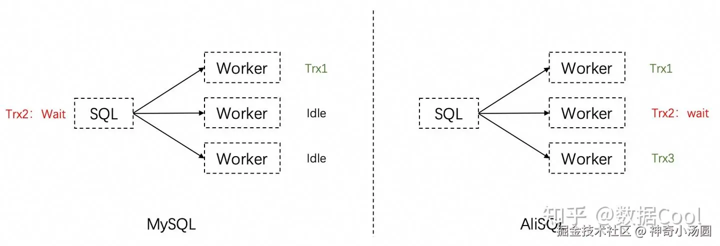 为了优化这个场景,AliSQL 将原本在SQL线程中的,阻塞后续事务分发的等待逻辑,放到了worker线程中。这样一来,如果有少量修改同行的小事务分布在中等事务之间,这些小事务会在worker线程中等待依赖的事务提交,而不是在SQL线程中等待,阻塞其他事务的分发。这样一来,这些没有冲突的中等事务也就能够并发起来了。