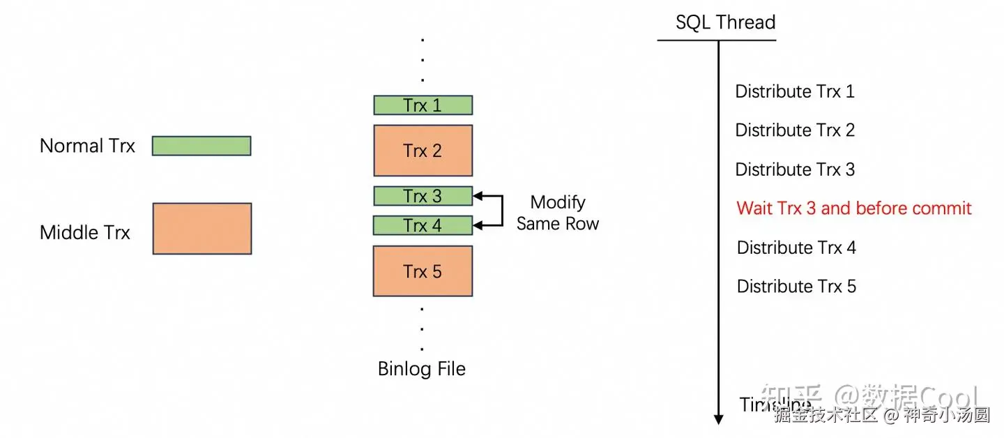如上图例子中,Trx2和Trx5是批量数据处理的中等事务;Trx3和Trx4是普通业务的小事务,并且修改了同一行数据。SQL线程在分发这些事务时,Trx2 和 Trx3都可以正常分发,Trx4则需等待Trx3及之前的所有事务都提交后,才能分发;这导致Trx5的分发是到了Trx2提交后才进行的,进而导致Trx2和Trx5无法并行应用。