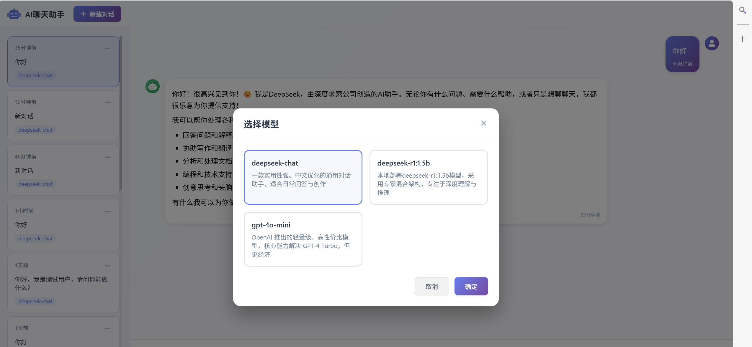 | TC009 | 新建对话 | 点击"新建对话"按钮 | 显示模型选择对话框 |