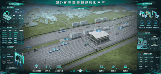 整备作业区全域态势监控模块,对待整区、作业区、验收区进行分区精细化建模,绑定轨道与各工位信息,融合视频监控与传感器数据,在 HT 3D 场景中叠加 2D 数据面板,JS 实时更新工位状态、机车位置、作业进度等信息,支持全局鸟瞰与局部聚焦切换,便于工作人员全面掌握作业区整体态势与细节情况。同时支持历史轨迹回放功能,为作业过程中的问题溯源提供便利,推动人工管理模式升级为数字化监管,提升作业区空间利用率与作业流畅度。