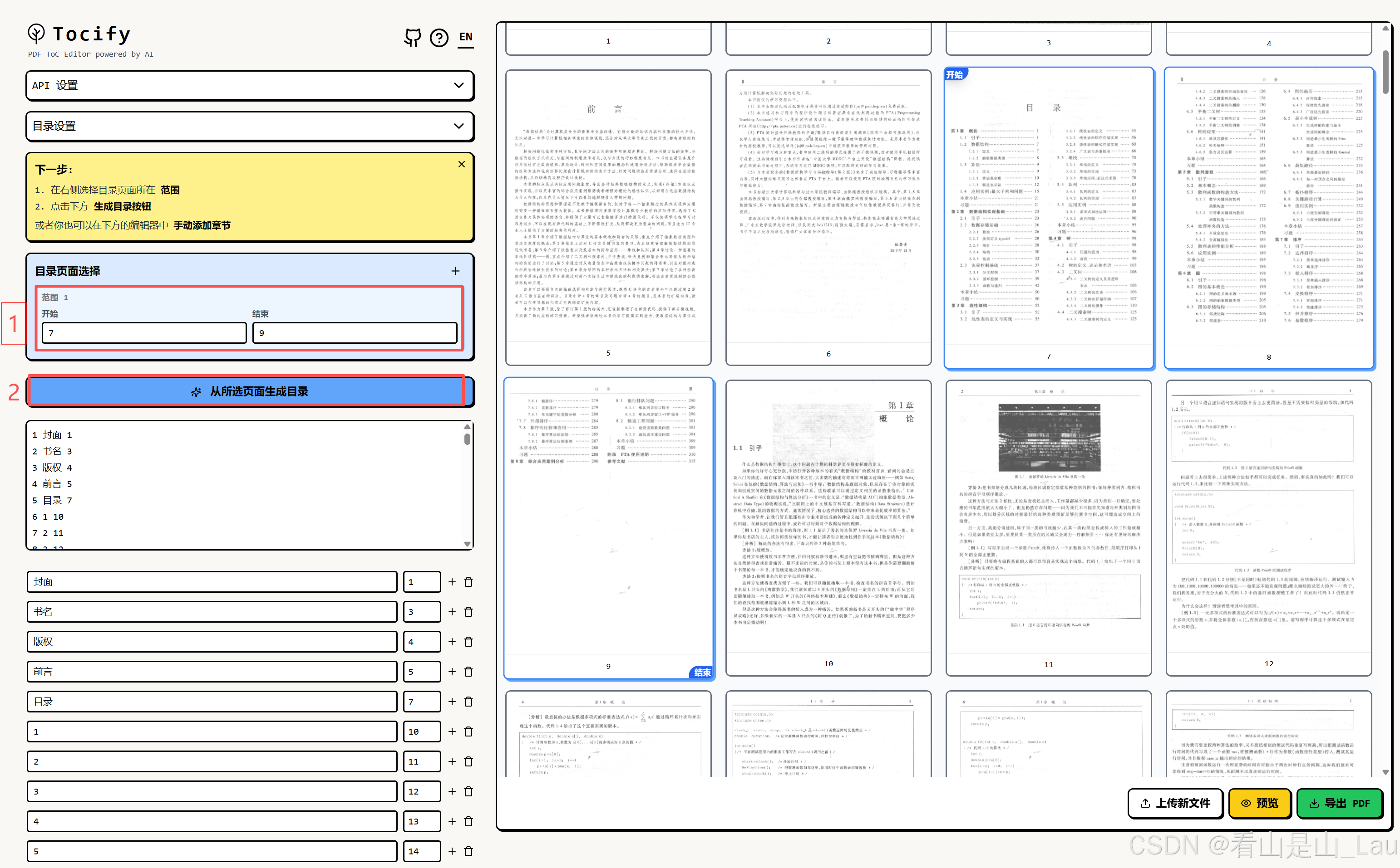 - 在工具界面中,选择PDF内实际包含目录的页面范围(示例为7-9页);