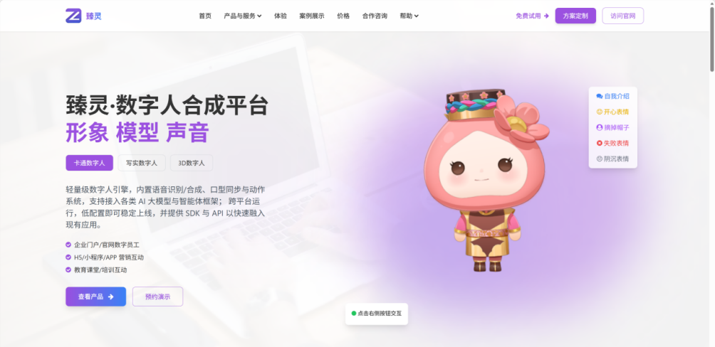 臻灵数字人平台 专注于实时互动数字人技术,提供从形象创建到部署落地的完整能力。平台支持2D/3D数字人形象、智能对话、多终端适配,适用于企业客服、在线教育、直播互动、品牌代言等多种场景。提供云端、私有化、混合部署等多种方式,满足不同企业的需求。