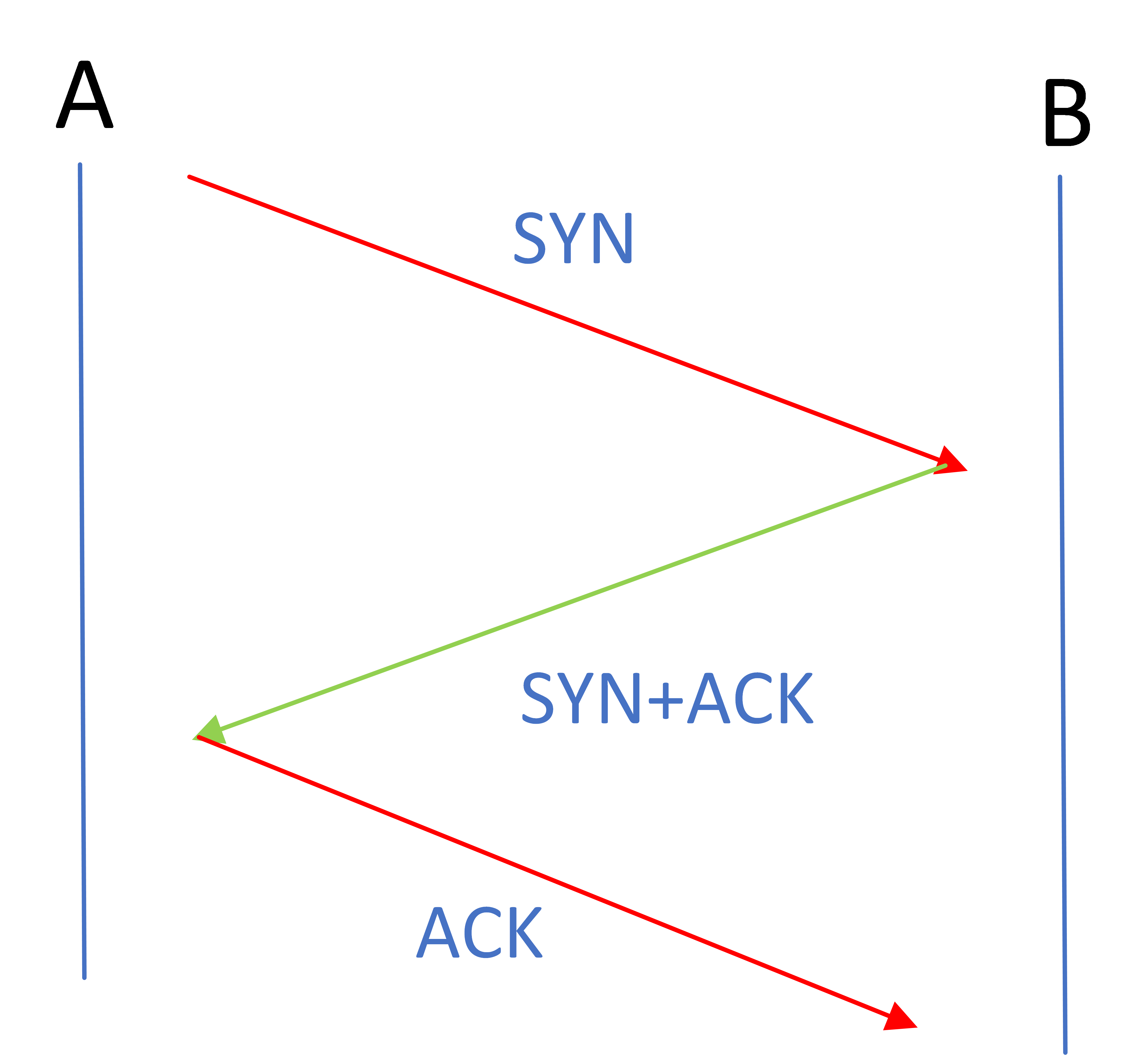 SYN报文为连接建立的请求,将携带SYN标识的称为同步报文段。建立连接的过程要经理三次握手的过程,三次握手是为了确保通信的双方既能收也能发,确保全双工通信,如下图所示: