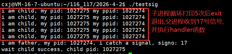 那么我们就使用handler对17号信号捕捉一下,捕捉方法是handler方法,即打印收到的信号编号,子进程打印信息,5秒时候子进程退出,当子进程退出的时候,看是否父进程对17号信号进行打印