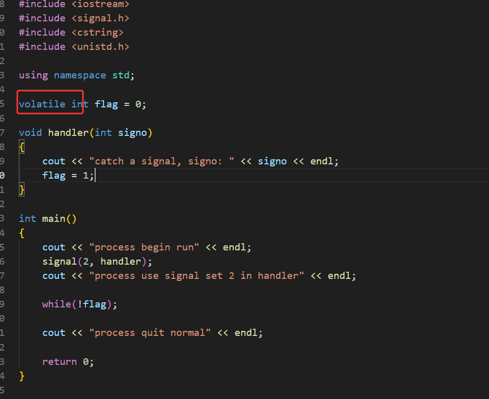 所以此时小编给进程发送2号信号,那么就会执行自定义捕捉方法,将物理内存中的flag修改为1,那么此时CPU执行while(!flag)再进行判断,但是由于进行了优化,CPU想要拿数据不会从物理内存中拿flag的值了,而是从自己的寄存器中拿flag的值0,这就造成了无论你物理内存中的flag的值变成什么,我CPU的从自己寄存器中拿到的flag永远是0,所以这也就造成了!flag == 1永远成立,所以while(!flag)也永远成立,while循环永远退不出去,所以进程也就无法通过2号信号的方式正常退出了,所以因为编译器的优化,让CPU和物理内存形成了一个屏障,最终造成了内存的不可见。