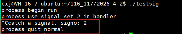不管我们的代码是死循环还是正常运行,硬件定时器都会每隔几毫秒自动触发一次时钟中断,强行把 CPU 从用户态拉进内核态。每次陷入内核,都会做 "信号检查",进入内核后,内核会在do_signal() 函数里第一时间检查当前进程有没有未处理的信号。我们按下 Ctrl+C 的瞬间,键盘中断触发,内核把SIGINT信号(2 号信号)挂到你的进程信号队列里。下一次时钟中断陷入时,才会真正处理信号,内核不会立刻处理信号,而是等到下一次时钟中断触发,CPU 再次陷入内核时,在 do_signal() 里检测到信号队列里有SIGINT,如果我们自定义了处理函数,就切回用户态执行你的sighandler。如果没自定义就执行系统默认动作(直接终止进程)。