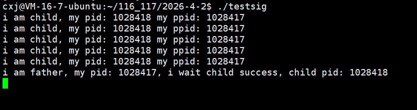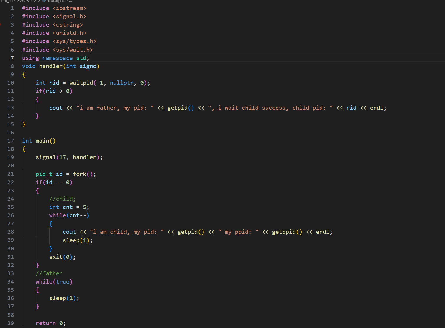 那么我们不妨摒弃之前的等待子进程的方法,让父进程做自己的事情,既然子进程退出的时候是会给父进程发送17号信号,那么我父进程完全可以提前捕捉17号信号,收到17号信号的时候,在handler方法内对子进程进行回收即可,但是这个过程必须保证父进程的运行时间比子进程的时间长,即父进程要晚于子进程退出,如果父进程早于子进程退出,那儿可怜的子进程不就成了孤儿进程了,所以父进程必须晚于子进程退出,那么子进程打印信息,运行5秒之后退出即可,由于父进程必须晚于子进程退出,所以我们让父进程死循环睡眠即可