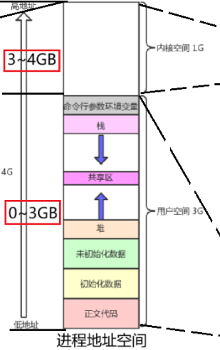 | 0 ~ 3GB | 用户空间 | 用户态可访问 | 包含:代码段、数据段、BSS 段(未初始化数据)、堆、共享区、栈、命令行参数 / 环境变量 |