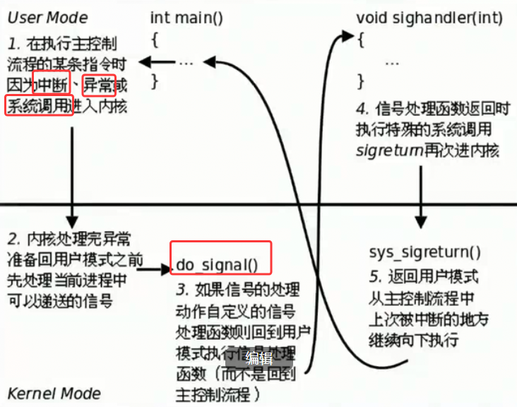 步骤 3:有自定义信号处理函数 → 切回用户态执行sighandler