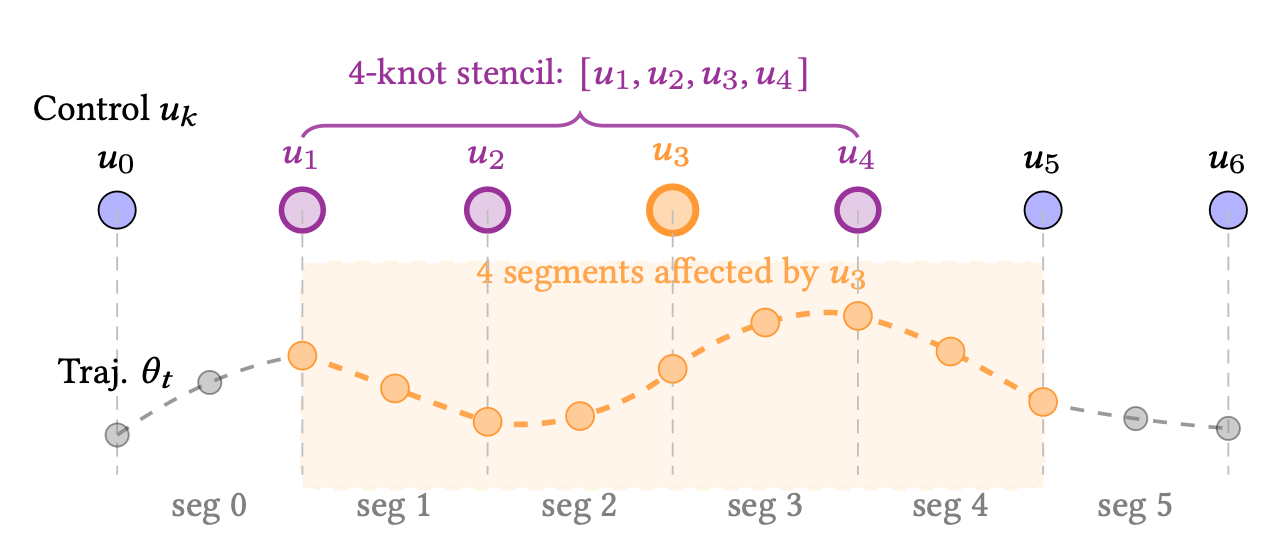 cuRoboV2 的B样条优化方法则完全不同。它将整条轨迹表示为一组B样条控制点(每个关节对应一组)。B样条是一种数学曲线,具有两个关键特性: