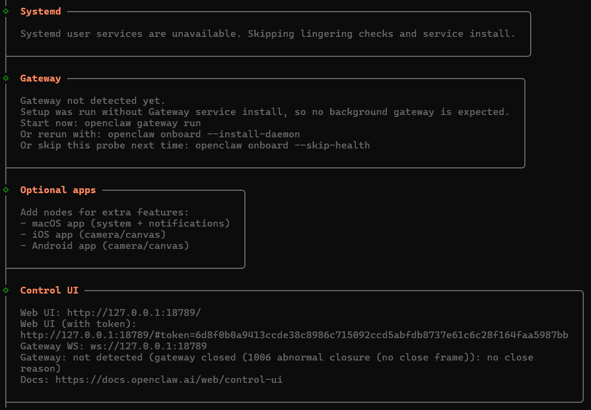 Systemd user services are unavailable为正常提示,说明当前环境不支持开机自启,不影响服务运行,可手动启动 - 网关启动日志 :