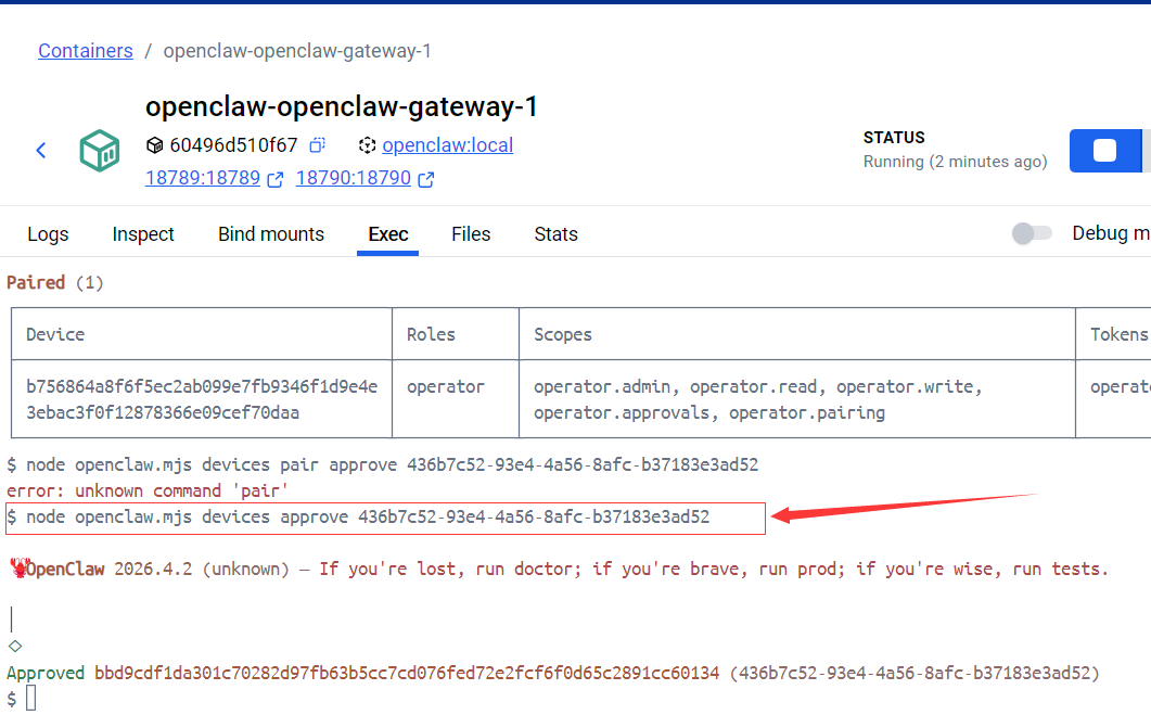 node openclaw.mjs devices list成功列出了设备列表,说明容器内执行入口正常
