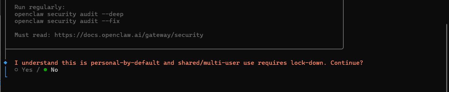I understand this is personal-by-default and shared/multi-user use requires lock-down. Continue?○ Yes / ● No