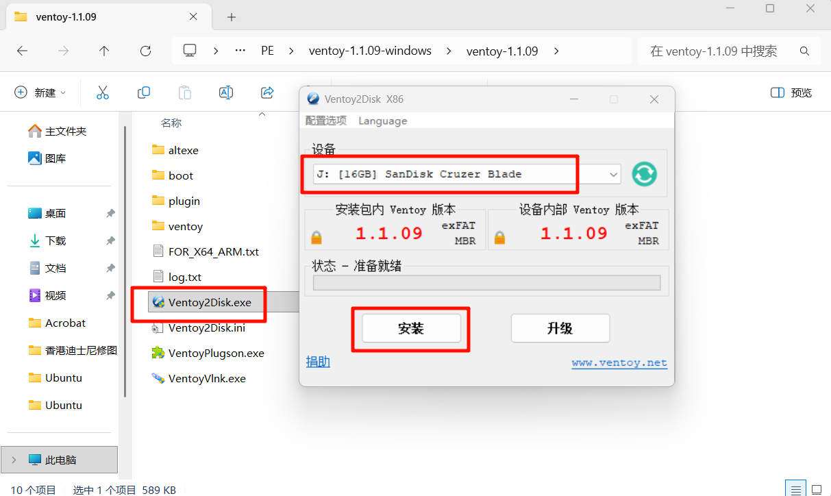 为了方便安装Ubuntu,需要先把U盘制作成启动盘,这个过程需要格式化U盘,所以请注意事先备份好U盘的数据。我们把Ventoy压缩包解压之后可以看到里面有个"Ventoy2Disk.exe"文件(你的系统不一定显示文件扩展名),然后双击启动它,在软件界面中选择你的U盘,直接点击"安装"按钮即可