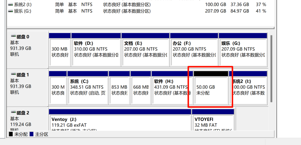 点击左下角的"磁盘管理"你就能看到自己的电脑上所有的硬盘,冰冰这里的H盘的剩余空间比较多,所以打算从H盘划分50G给Ubuntu,那我就选中H盘,右键,压缩卷