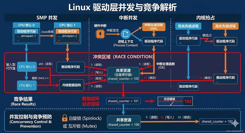多核抢占(SMP):在多核 CPU 上,核 A 在运行驱动,核 B 也在运行同样的驱动代码,两者物理并行。