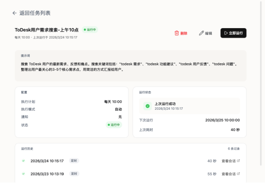 ● 定时任务会到点自动执行,执行记录如之前有对应会话,则会在之前会话中显示对应的记录;如之前没对应会话,则会创建一条当前定时任务的会话记录,后续的定时任务执行将显示在此。