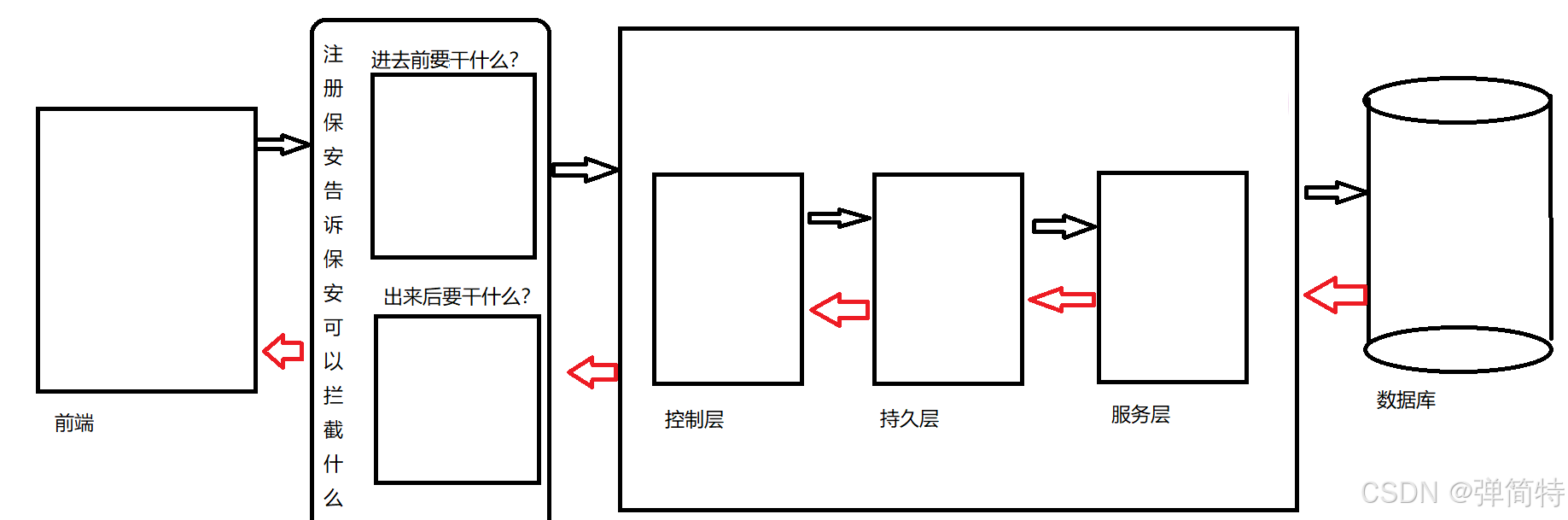 - 进门前(preHandle) :保安会检查你有没有带身份证,没带?对不起,不能进去。这一步可以直接拦下请求。