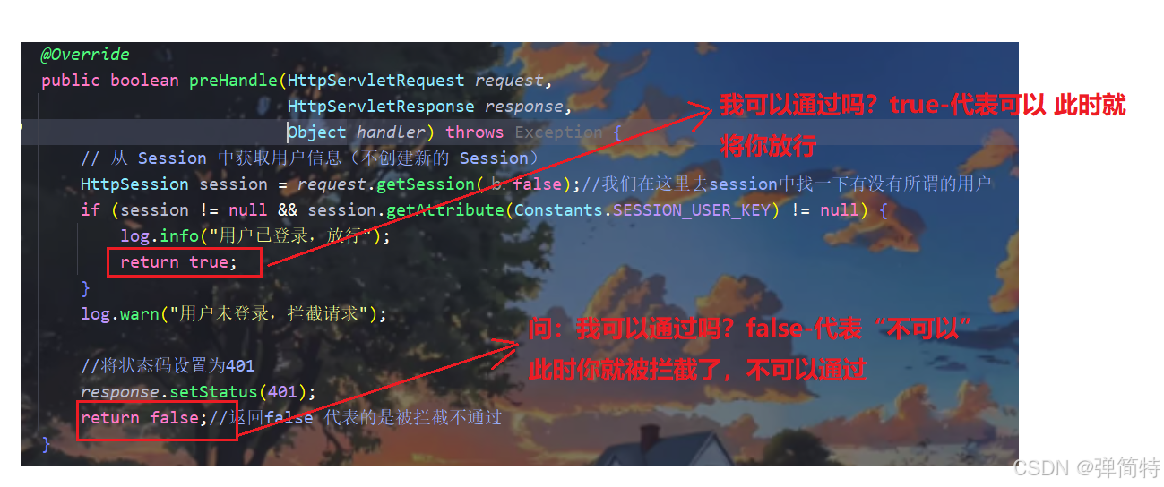 注意 :我们重点关注 preHandle 方法,因为它是在请求进入 Controller 之前执行的。我们在这里检查 Session 里有没有用户信息,有就返回 true 放行,没有就返回 false 拦截,并返回 401 状态码。这就是保安的"查证"工作。