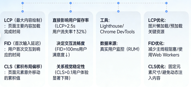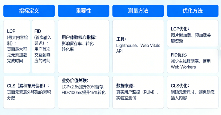 重要性:LCP 是衡量页面主要视觉内容加载速度的关键指标。较快的 LCP 意味着用户能更快地看到页面的核心内容,提升用户的满意度。