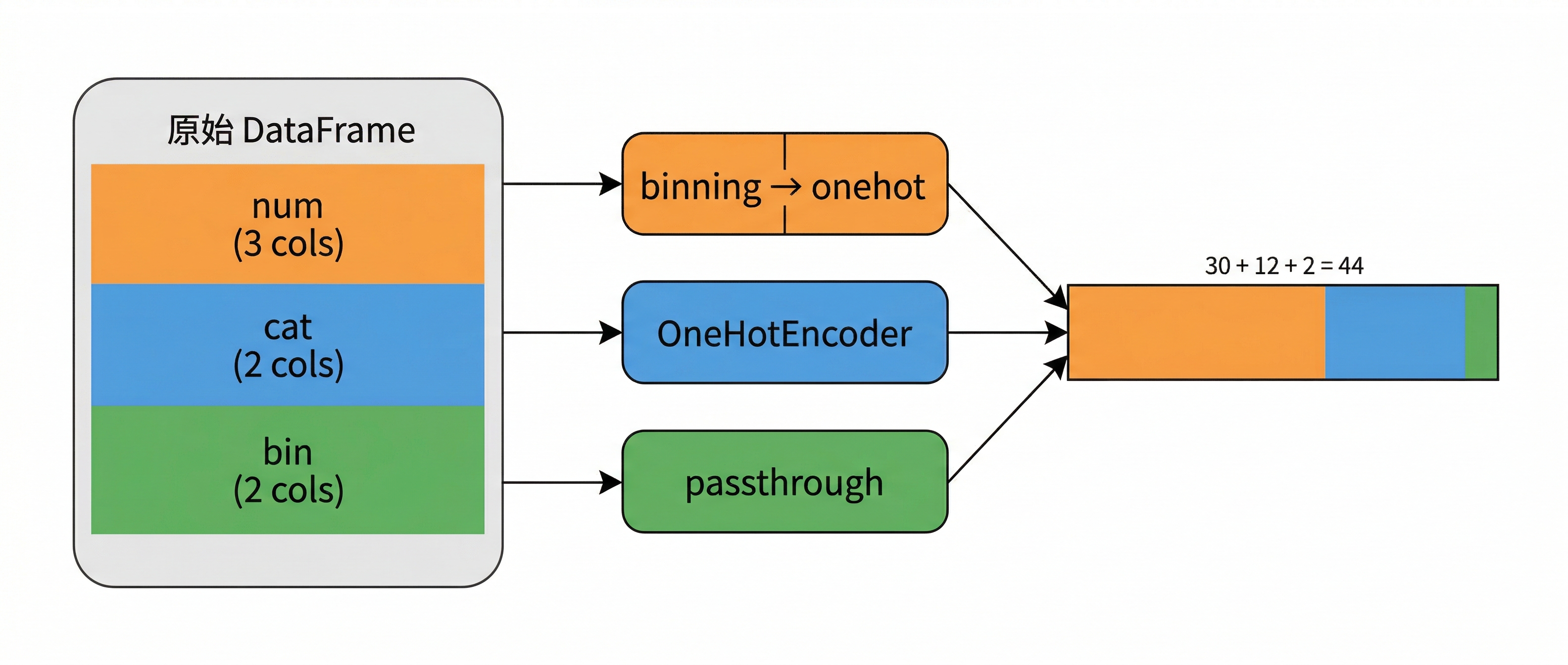 一张表进来,按列类型拆成三路:数值特征走"分箱→独热"两步管道,类别特征直接独热编码,二值特征原样通过。三路输出水平拼接成一个 44 列的矩阵,3 个数值特征各10 箱独热得 30 列,类别特征展开 12 列,二值特征 2 列。这个拆-处理-拼的过程就是 ColumnTransformer 自动完成的。