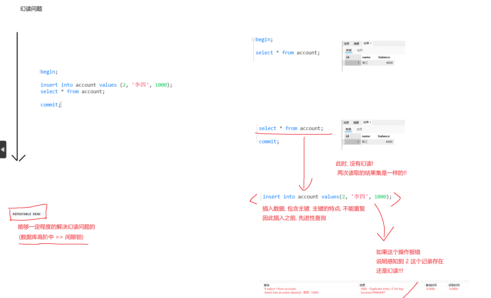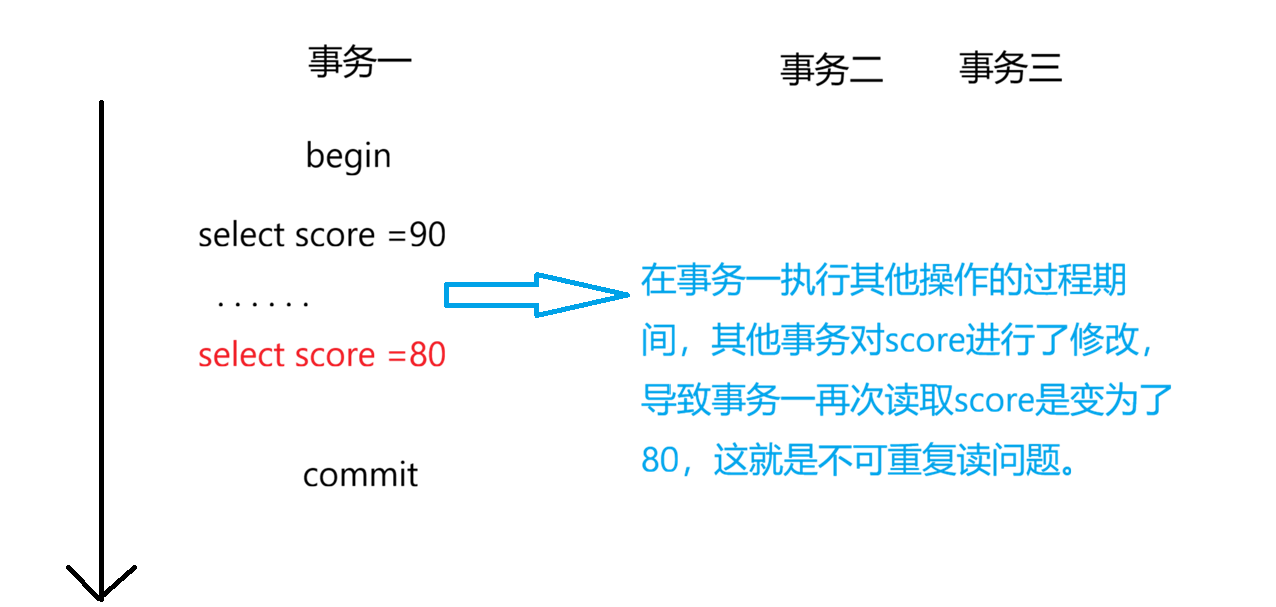 同一事务里,两次读取同一数据,结果不一样,因为中间被其他事务修改提交了。