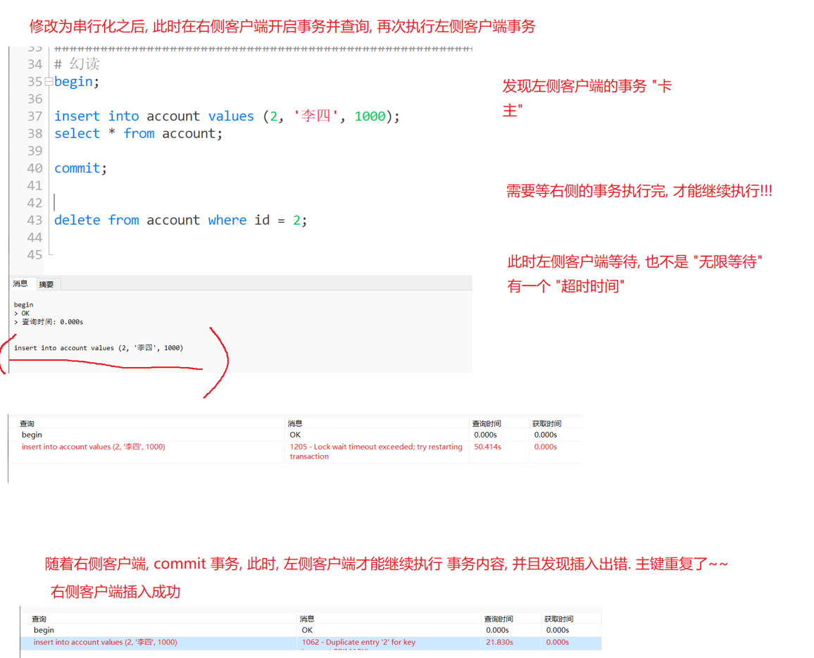 需要进行 "串行化" 彻底让服务器 "串行的" 处理事务,一条一条的处理,彻底避免幻读问题;这也会造成一些影响,并发程度降低,隔离性提高,执行效率进一步降低,数据准确性进一步提高!