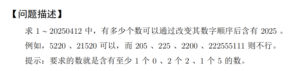 这段代码是在解决一个数位统计问题。简单来说,它的任务是找出 1 到 20250412 之间,所有包含"至少一个 0、两个 2、一个 5"的数字,并统计它们的总数量。